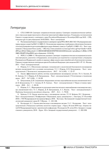 1. СП 2.5.3650-20. Санитарно-эпидемиологические правила. Санитарно-эпидемиологические требования к отдельным видам транспорта и объектам транспортной инфраструктуры. Утверждены постановлением Главного государственного санитарного врача Российской Федерации от 16 октября 2020 года №30. -URL: www.pravo.gov.ru (дата обращения: 24.02.2024). -Текст: электронный.