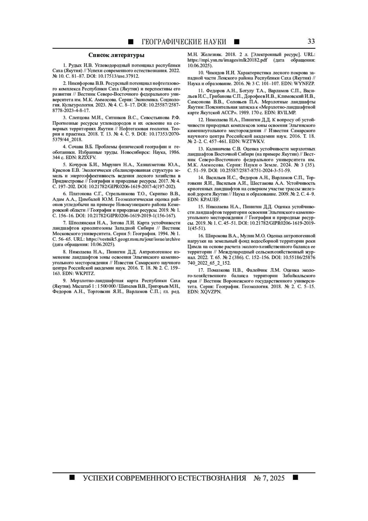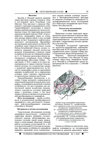 7. Шполянская Н.А., Зотова Л.И. Карта устойчивости ландшафтов криолитозоны Западной Сибири // Вестник Московского университета. Серия 5: География. 1994. № 1. С. 56-65. URL: https://vestnik5.geogr.msu.ru/jour/issue/archive (дата обращения: 10.06.2025).