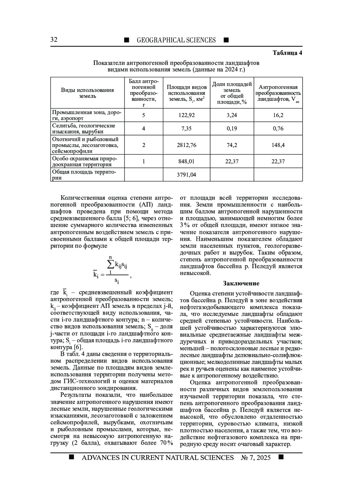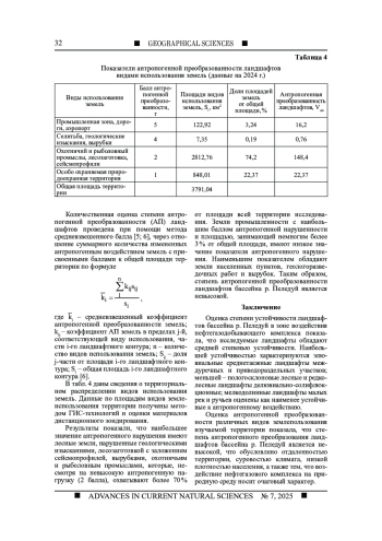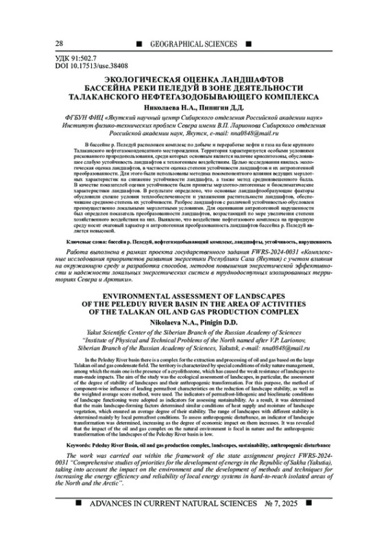 В бассейне р. Пеледуй расположен комплекс по добыче и переработке нефти и газа на базе крупного Талаканского нефтегазоконденсатного месторождения. Территория характеризуется особыми условиями рискованного природопользования, среди которых основным является наличие криолитозоны, обусловившее слабую устойчивость ландшафтов к техногенным воздействиям. Целью исследования явилась экологическая оценка ландшафтов, в частности оценка степени устойчивости ландшафтов и их антропогенной преобразованности. Для этого были использованы методика покомпонентного влияния ведущих мерзлотных характеристик на снижение устойчивости ландшафта, а также метод средневзвешенного балла. В качестве показателей оценки устойчивости были приняты мерзлотно-литогенные и биоклиматические характеристики ландшафтов. В результате определено, что основные ландшафтообразующие факторы обусловили схожие условия теплообеспеченности и увлажнения растительности ландшафтов, обеспечившие среднюю степень их устойчивости. Разброс ландшафтов с различной устойчивостью обусловлен преимущественно локальными мерзлотными условиями. Для оценивания антропогенной нарушенности был определен показатель преобразованности ландшафтов, возрастающий по мере увеличения степени хозяйственного воздействия на них. Выявлено, что воздействие нефтегазового комплекса на природную среду носит очаговый характер и антропогенная преобразованность ландшафтов бассейна р. Пеледуй является невысокой. Работа выполнена в рамках проекта государственного задания FWRS-2024-0031 «Комплексные исследования приоритетов развития энергетики Республики Саха (Якутия) с учетом влияния на окружающую среду и разработка способов, методов повышения энергетической эффективности и надежности локальных энергетических систем в труднодоступных изолированных территориях Севера и Арктики».