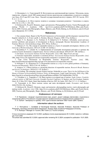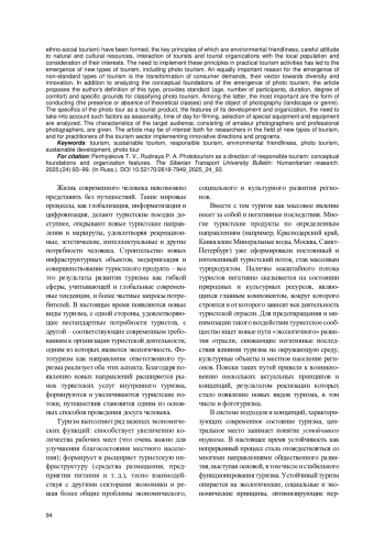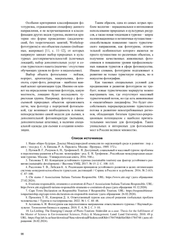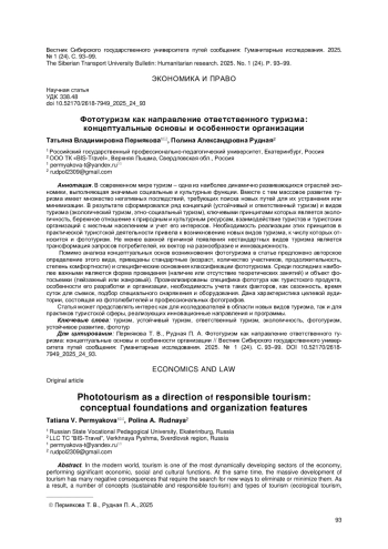 ПЕРМЯКОВА Т. В., РУДНАЯ П. А. ФОТОТУРИЗМ КАК НАПРАВЛЕНИЕ ОТВЕТСТВЕННОГО ТУРИЗМА: КОНЦЕПТУАЛЬНЫЕ ОСНОВЫ И ОСОБЕННОСТИ ОРГАНИЗАЦИИ // ВЕСТНИК СИБИРСКОГО ГОСУДАРСТВЕННОГО УНИВЕРСИТЕТА ПУТЕЙ СООБЩЕНИЯ: ГУМАНИТАРНЫЕ ИССЛЕДОВАНИЯ. 2025. № 1 (24)