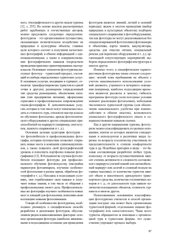 В современном мире туризм - одна из наиболее динамично развивающихся отраслей экономики, выполняющая значимые социальные и культурные функции. Вместе с тем массовое развитие туризма имеет множество негативных последствий, требующих поиска новых путей для их устранения или минимизации. В результате сформировался ряд концепций (устойчивый и ответственный туризм) и видов туризма (экологический туризм, этно-социальный туризм), ключевыми принципами которых является экологичность, бережное отношение к природным и культурным ресурсам, взаимодействие туристов и туристских организаций с местным населением и учет его интересов. Необходимость реализации этих принципов в практической туристской деятельности привела к возникновению новых видов туризма, к числу которых относится и фототуризм. Не менее важной причиной появления нестандартных видов туризма является трансформация запросов потребителей, их вектор на разнообразие и инновационность. Помимо анализа концептуальных основ возникновения фототуризма в статье предложено авторское определение этого вида, приведены стандартные (возраст, количество участников, продолжительность, степень комфортности) и специфические основания классификации фототуризма. Среди последних наиболее важными являются форма проведения (наличие или отсутствие теоретических занятий) и объект фотосъемки (пейзажный или жанровый). Проанализированы специфика фототура как туристского продукта, особенности его разработки и организации, необходимость учета таких факторов, как сезонность, время суток для съемок, подбор специального снаряжения и оборудования. Дана характеристика целевой аудитории, состоящая из фотолюбителей и профессиональных фотографов. Статья может представлять интерес как для исследователей в области новых видов туризма, так и для практиков туристской сферы, реализующих инновационные направления и программы.
