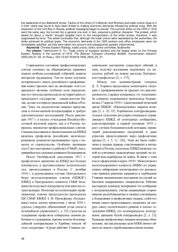 Публикация посвящена одной из драматических страниц истории развития профессиональных союзов в зоне Китайско-Восточной железной дороги (КВЖД) на фоне гражданской войны в России. На основе выявленных архивных источников, многие из которых впервые вводятся в научный оборот, опубликованных и неопубликованных воспоминаний рассматриваются причины, ход и последствия крупнейшей в бытность КВЖД забастовки транспортных профсоюзов, произошедшей летом 1919 г. Организационно профдвижение железнодорожников КВЖД к рассматриваемому периоду представляло собой несколько производственных объединений. Важнейшим из них являлся Союз мастеровых и рабочих КВЖД, в деятельности которого самое активное участие принимали большевики, видевшие в нем основной рычаг давления на белогвардейский режим генерала Д. Л. Хорвата в полосе отчуждения дороги. В результате отношения между официальной администрацией и революционизирующимися профсоюзами приобрели характер периодических забастовок персонала КВЖД под руководством пробольшевистских сил. Установлено, что тактика Союза мастеровых и рабочих и близких ему по воззрениям профсоюзов сводилась к выдвижению экономических требований с последующим присоединением политических. С разрастанием гражданской войны в России политические тезисы усиливались. Летняя забастовка на КВЖД в 1919 г. пошла тем же путем, но переросла во всеобщую и приобрела по сути политический характер. Протест, продолжавшийся около месяца, приносил ощутимый вред транспортным перевозкам белых армий, поэтому был подавлен силовым методом. В статье делается вывод о том, что хотя профсоюзы подверглись репрессиям со стороны властей, но забастовка достигла своих политических целей. Экономические требования рабочих и служащих КВЖД сразу не были удовлетворены, но учтены и впоследствии все таки частично реализованы.