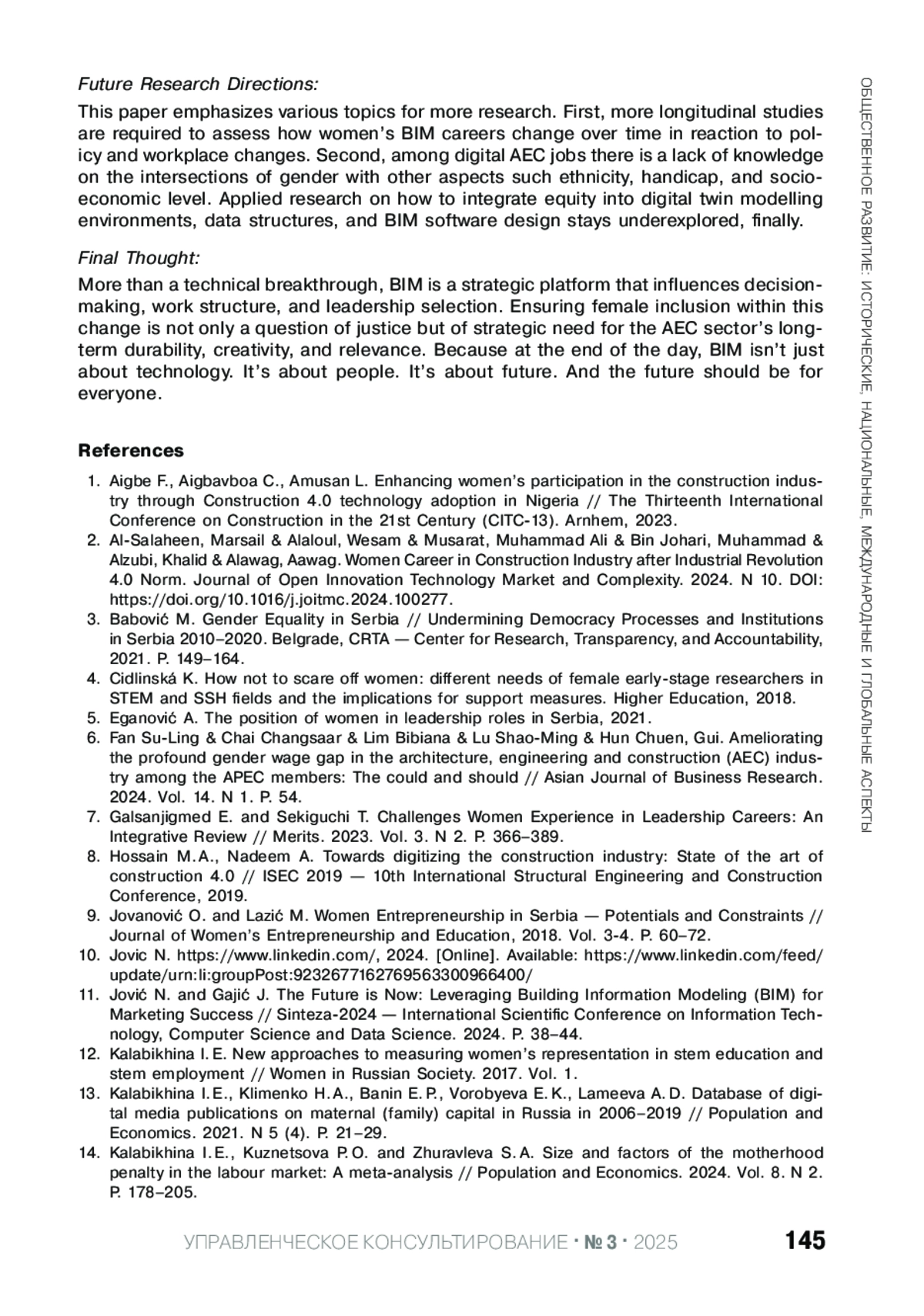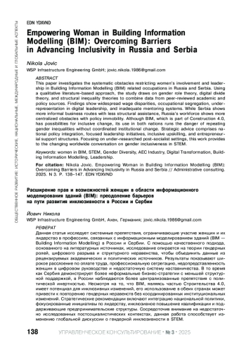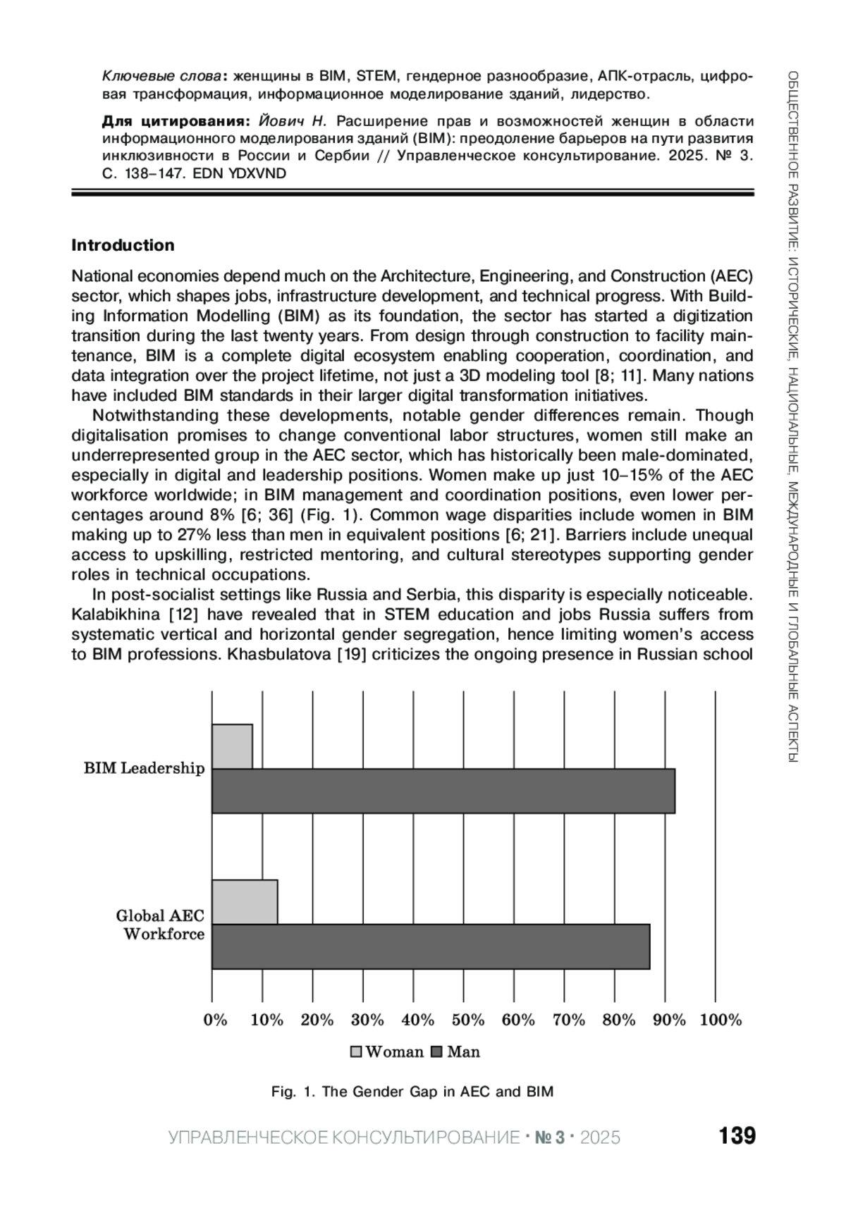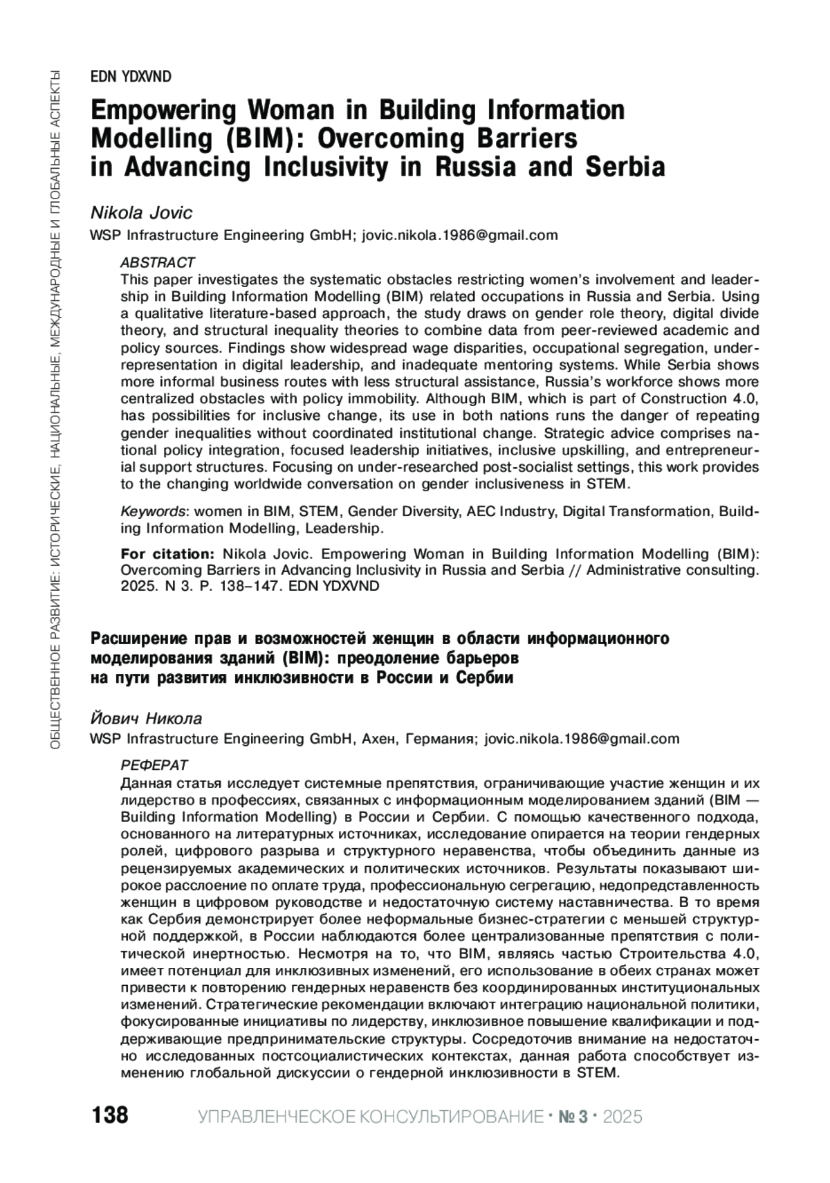 Статья: РАСШИРЕНИЕ ПРАВ И ВОЗМОЖНОСТЕЙ ЖЕНЩИН В ОБЛАСТИ ИНФОРМАЦИОННОГО МОДЕЛИРОВАНИЯ ЗДАНИЙ (BIM): ПРЕОДОЛЕНИЕ БАРЬЕРОВ НА ПУТИ РАЗВИТИЯ ИНКЛЮЗИВНОСТИ В РОССИИ И СЕРБИИ (2025)
