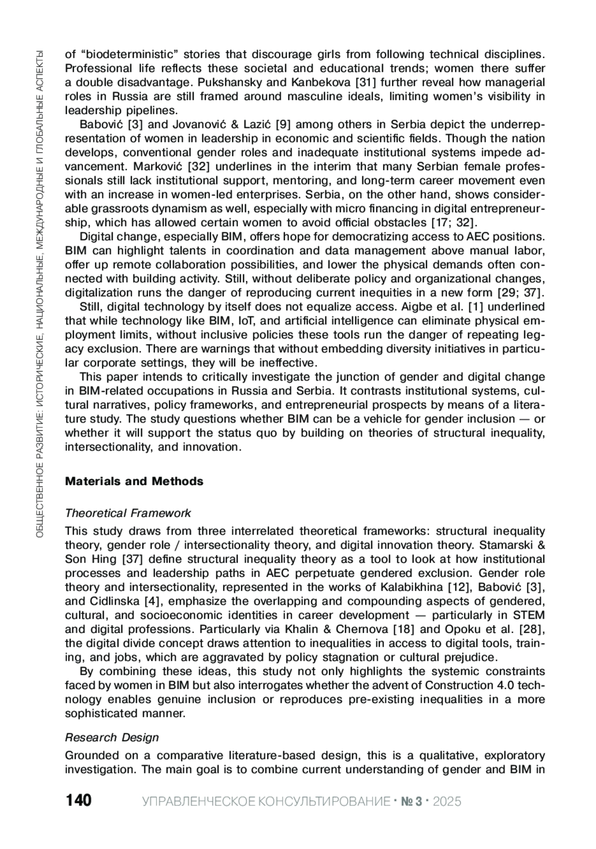 ЙОВИЧ Н. РАСШИРЕНИЕ ПРАВ И ВОЗМОЖНОСТЕЙ ЖЕНЩИН В ОБЛАСТИ ИНФОРМАЦИОННОГО МОДЕЛИРОВАНИЯ ЗДАНИЙ (BIM): ПРЕОДОЛЕНИЕ БАРЬЕРОВ НА ПУТИ РАЗВИТИЯ ИНКЛЮЗИВНОСТИ В РОССИИ И СЕРБИИ // УПРАВЛЕНЧЕСКОЕ КОНСУЛЬТИРОВАНИЕ. 2025. № 3 (189)