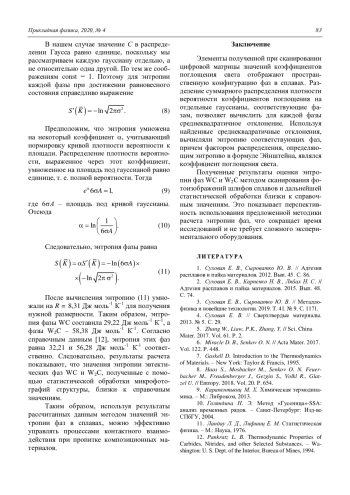 Расчет энтропии как одной из основных термодинамических характеристик позволяет изучать условия равновесия системы, в частности, исследовать процессы контактного взаимодействия при пропитке композиционных материалов. В работе предложен метод вычисления энтропии фаз в сплавах с использованием сканирования их оцифрованных фотоизображений с помощью программы TLC_Manager_4_0_15VA и дальнейшей статистической обработки. При сканировании формировалась матрица значений, выраженных через коэффициенты поглощения света от поверхности шлифа сплава. Статистические данные многокомпонентной структуры разделяли на отдельные гауссианы, соответствующие определенным фазам. При этом аппроксимировали квадратичной функцией в логарифмическом представлении участки кривой суммарного распределения плотности вероятности коэффициентов поглощения света. Параметры гауссиан вычисляли исходя из того, что зависимость логарифмического представления функции нормального распределения имеет вид квадратичной функции. Это позволило вычислить среднеквадратичные отклонения гауссиан, необходимые для расчета энтропии фаз. Полученные значения энтропии фаз карбидов вольфрама WC и W2C удовлетворительно совпадают со справочными данными.