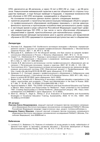 1. Ломтева Е. В., Бедарева Л. Ю. Особенности мотивации молодежи к обучению: перераспределение спроса с высшего на среднее профессиональное образование // Экономическое развитие России. 2021. Т. 28. № 8. С. 58-62. EDN: MBFNHS