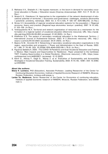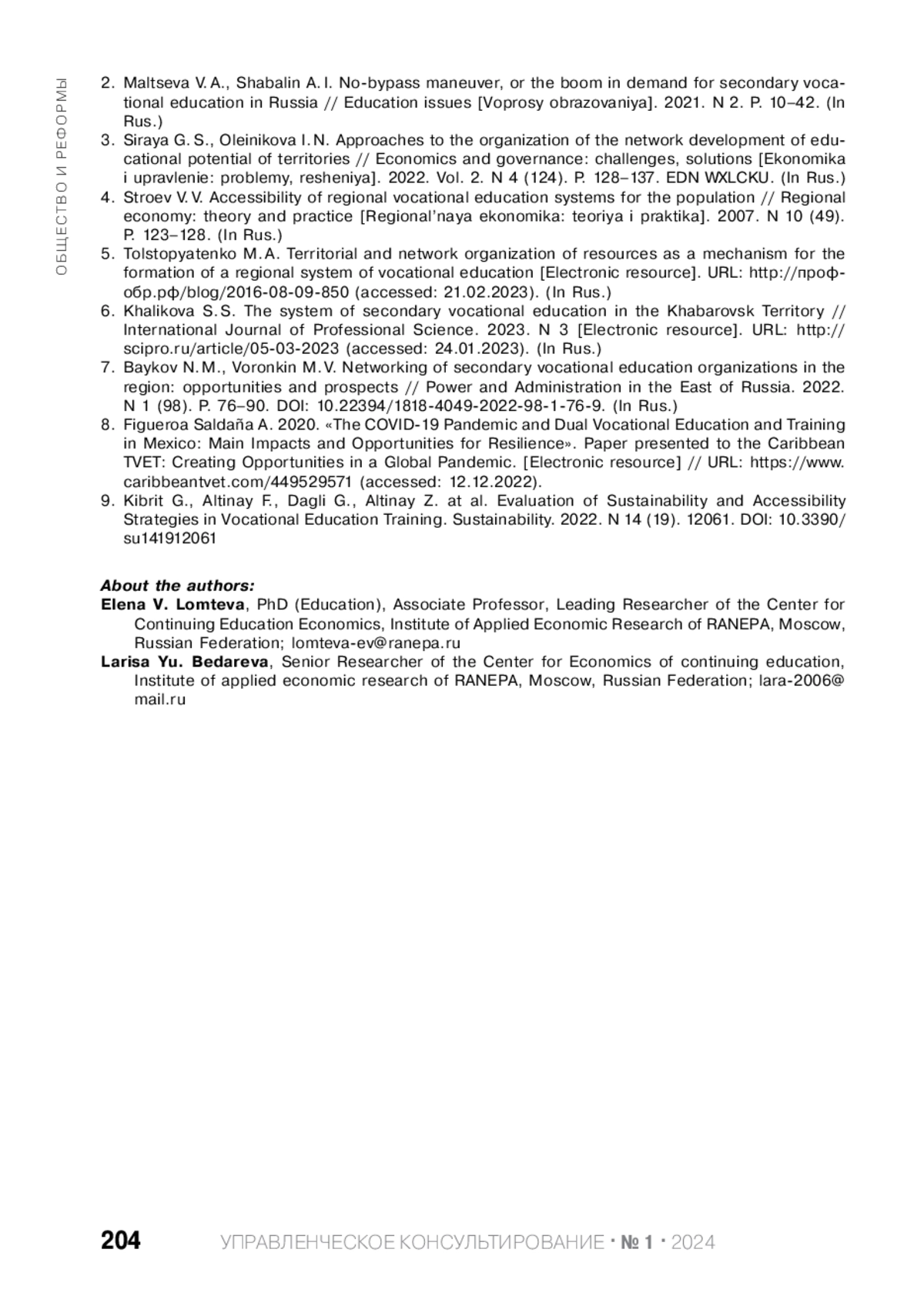 7. Baykov N. M., Voronkin M. V. Networking of secondary vocational education organizations in the region: opportunities and prospects // Power and Administration in the East of Russia. 2022. N 1 (98). P. 76-90. DOI: 10.22394/1818-4049-2022-98-1-76-9 EDN: EQKPJV