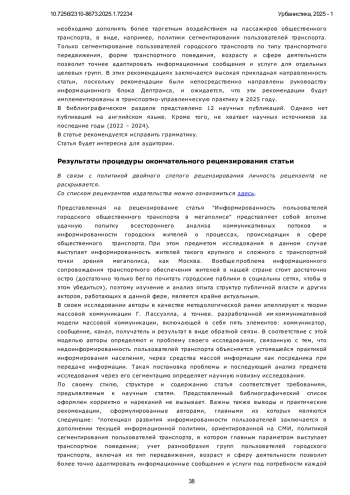 Предметом исследования является сегментация пользователей городского транспорта, основанная на транспортном поведении, что позволяет уточнить сильные и слабые стороны работы по информированию пользователей. Основная гипотеза исследования - недоинформированность пользователей связана с устоявшейся практикой информирования населения, а именно с преимущественной ориентацией на средства массой информации как посредника при передаче информации. Однако массовые СМИ могут помочь донести информацию до возможно большего числа людей, сделать факт известным многим, но их возможности ограничены в том, чтобы в процессе информирования учитывать специфику отдельных групп или категорий потребителей транспортных услуг. Для решения проблемы предложено исследовать варианты сегментации потребителей, основанные на особенностях транспортного поведения горожан, выделяя частоту использования транспорта и цель поездки как признаки сегментирования, обладающие наибольшей схожестью. В исследовании применены социологические методы - интервью экспертов, фокус-группы и анкетный опрос пользователей. Получены результаты исследования, объясняющие недостатки традиционной информационной политики - информирование без учёта специфики целевых групп пользователей общественного транспорта и дорожно-транспортной инфраструктурой, отсутствие обсуждения проблем в информационных сообщениях. Определены сильные и слабые стороны информационной работы Дептранса Москвы. Руководству информационного блока Дептранса рекомендовано предусмотреть наряду с общим информированием всех жителей столицы (посредством передачи сообщений во все СМИ) информационные сообщения, подготовленные для отдельных целевых групп, предварительно выделив такие группы на основе анализа транспортного поведения жителей Москвы и Подмосковья. Направления работы по устранению дефицитов: 1. Официальный сайт Дептранса, его Телеграм-каналы и чат-бота «Александра», не пользующиеся популярностью жителей столицы. 2. Официальность информации («отчётность») вместо рассмотрения проблем с учётом мнений различных групп пользователей городского транспорта. 3. Использование опыта мировых мегаполисов: •Опросы пользователей независимыми организациями •Регулярное интервьюирование экспертов, как индивидуальные, так и институциональные, т. е. из независимых, некоммерческих организаций •Отношение к планируемым проектам 4. Упреждающее информирование - как позитивного, так и предупредительного характера - при котором новость, интересная конкретным группам пользователей ОТ и ДТИМ, будет ими распространяться (по каналам «сарафанного радио»).