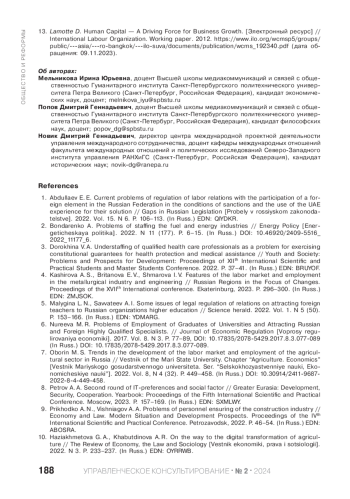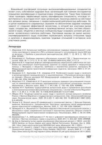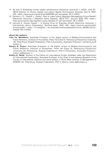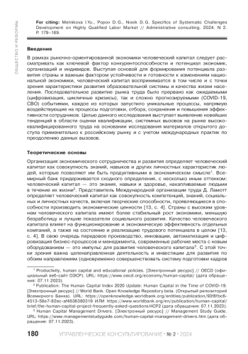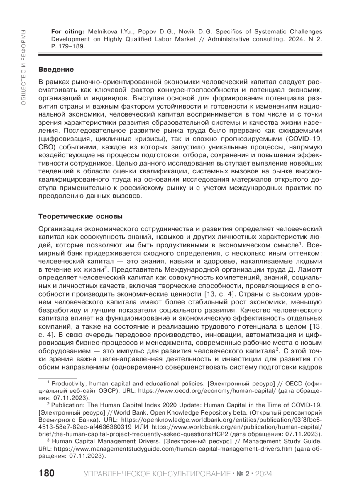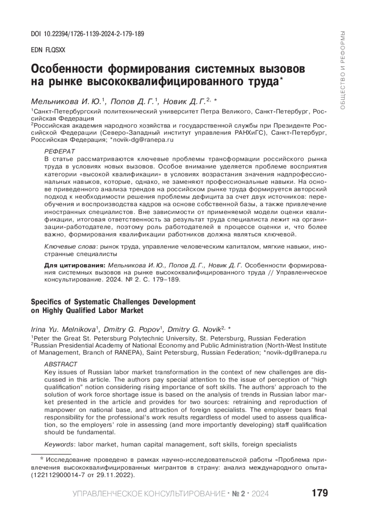 МЕЛЬНИКОВА И. Ю., ПОПОВ Д. Г., НОВИК Д. Г. ОСОБЕННОСТИ ФОРМИРОВАНИЯ СИСТЕМНЫХ ВЫЗОВОВ НА РЫНКЕ ВЫСОКОКВАЛИФИЦИРОВАННОГО ТРУДА // УПРАВЛЕНЧЕСКОЕ КОНСУЛЬТИРОВАНИЕ. 2024. № 2 (182)