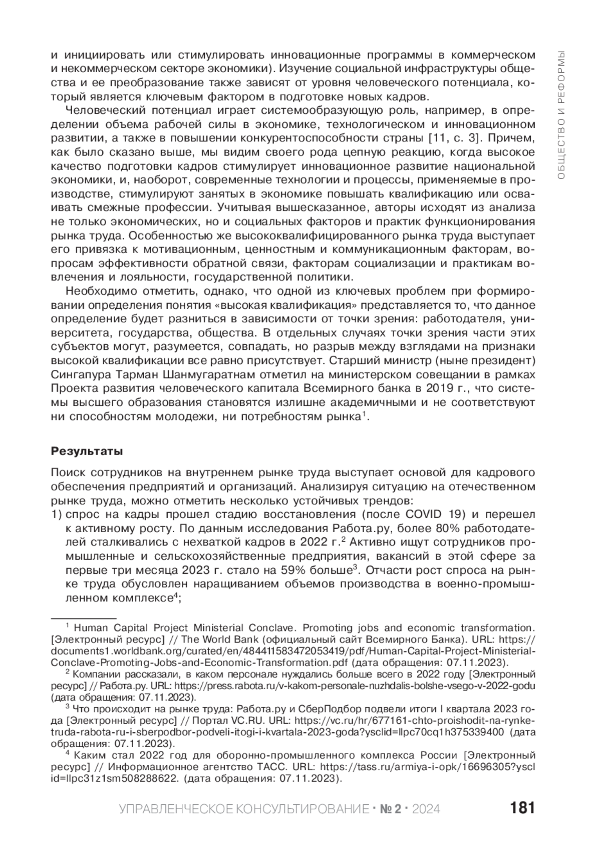 Статья: ОСОБЕННОСТИ ФОРМИРОВАНИЯ СИСТЕМНЫХ ВЫЗОВОВ НА РЫНКЕ ВЫСОКОКВАЛИФИЦИРОВАННОГО ТРУДА (2024)