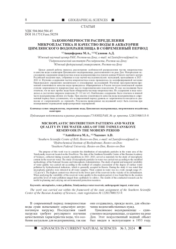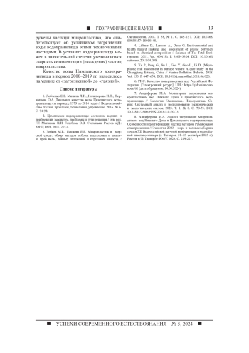 Статья: ЗАКОНОМЕРНОСТИ РАСПРЕДЕЛЕНИЯ МИКРОПЛАСТИКА И КАЧЕСТВО ВОДЫ В АКВАТОРИИ ЦИМЛЯНСКОГО ВОДОХРАНИЛИЩА В СОВРЕМЕННЫЙ ПЕРИОД (2024)