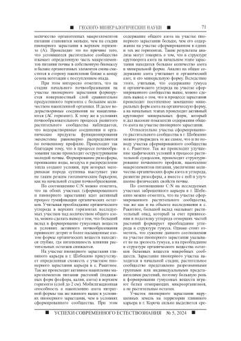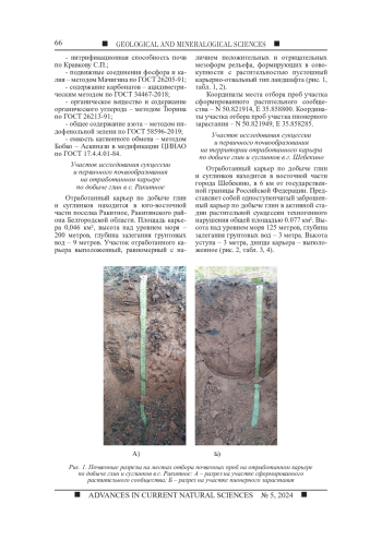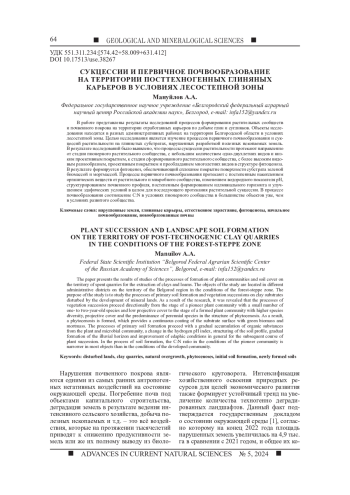 В работе представлены результаты исследований процессов формирования растительных сообществ и почвенного покрова на территории отработанных карьеров по добыче глин и суглинков. Объекты исследования находятся в разных административных районах на территории Белгородской области в условиях лесостепной зоны. Целью исследования является изучение процессов первичного почвообразования и сукцессий растительности на глинистых субстратах, нарушенных разработкой полезных ископаемых земель. В результате исследований было выявлено, что процессы сукцессии растительности протекают направленно от стадии пионерного растительного сообщества, с небольшим количеством одно-двухлетних видов и низким проективным покрытием, к стадии сформированного растительного сообщества, с более высоким видовым разнообразием, проективным покрытием и преобладанием многолетних видов в структуре фитоценоза. В результате формируется фитоценоз, обеспечивающий сплошное покрытие поверхности субстрата зеленой биомассой и мортмассой. Процессы первичного почвообразования протекают с постепенным накоплением органических веществ от растительного и микробного сообщества, изменением водородного показателя рН, структурированием почвенного профиля, постепенным формированием иллювиального горизонта и улучшением эдафических условий в целом для последующего протекания растительной сукцессии. В процессе почвообразования соотношение C: N в условиях пионерного сообщества в большинстве объектов уже, чем в условиях развитого сообщества.