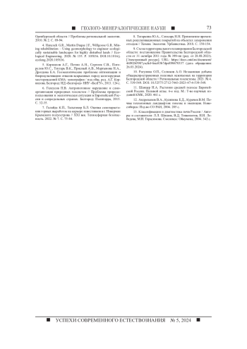 3. Петрищев В.П., Чибилев А.А. Закономерности формирования современной ландшафтной структуры горно-технических комплексов медноколчеданных месторождений Оренбургской области // Проблемы региональной экологии. 2010. № 2. С. 89-94. EDN: MUFKJN