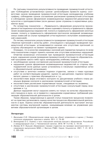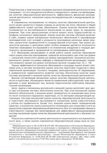 2. Винокурова О. С. Оценка и пути повышения качества высшего образования. Российский и международный опыт // Человеческий капитал. 2018. № 11(119). С. 16-24. EDN: VKPOGN