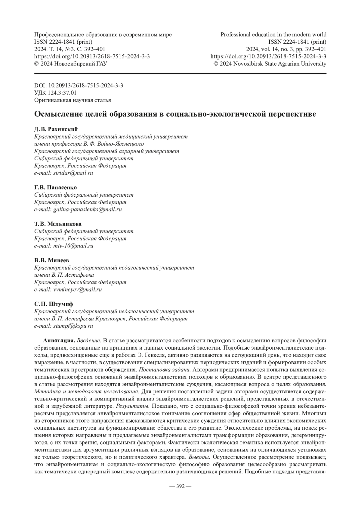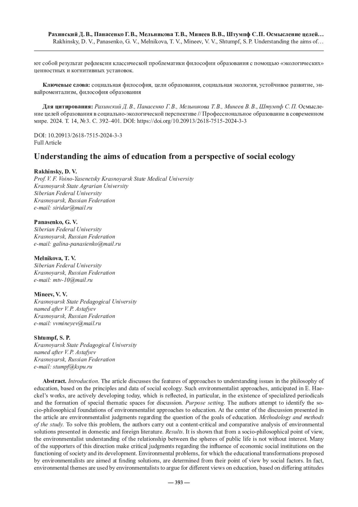 Введение. В статье рассматриваются особенности подходов к осмыслению вопросов философии образования, основанные на принципах и данных социальной экологии. Подобные энвайронменталистские подходы, предвосхищенные еще в работах Э. Геккеля, активно развиваются на сегодняшний день, что находит свое выражение, в частности, в существовании специализированных периодических изданий и формировании особых тематических пространств обсуждения.