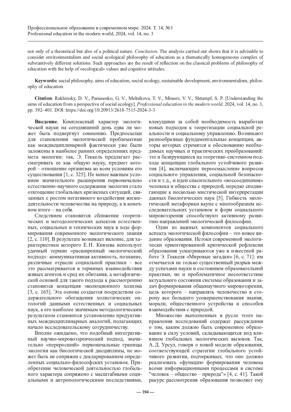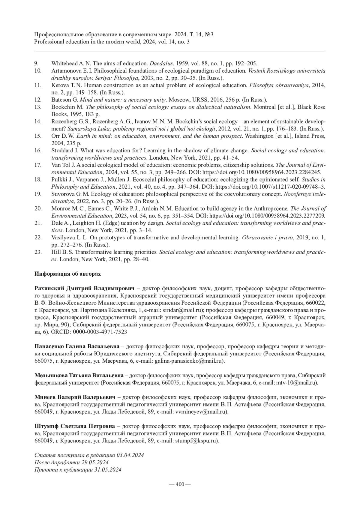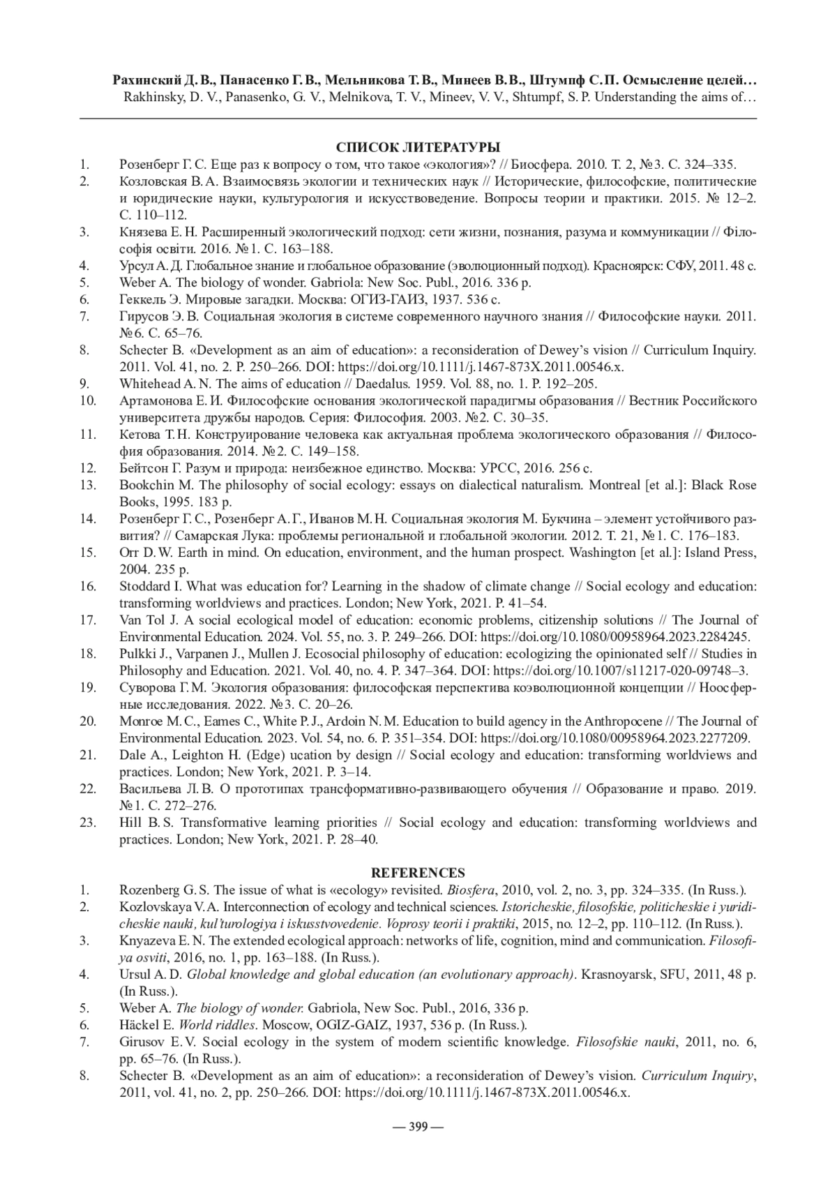 18. Pulkki J., Varpanen J., Mullen J. Ecosocial philosophy of education: ecologizing the opinionated self // Studies in Philosophy and Education. 2021. Vol. 40, no. 4. P. 347-364. https://doi.org/https://doi.org/10.1007/s11217-020-09748-3.