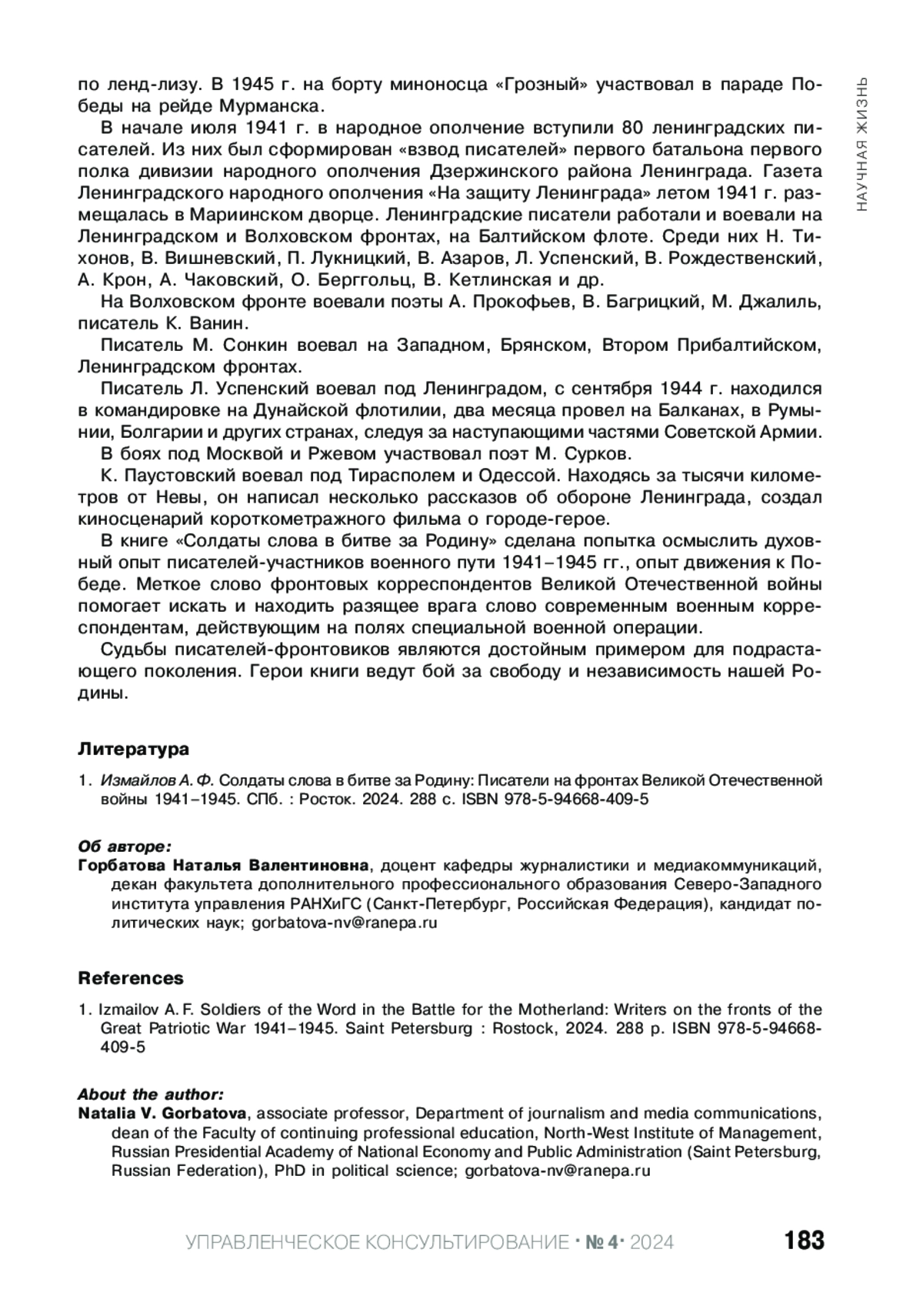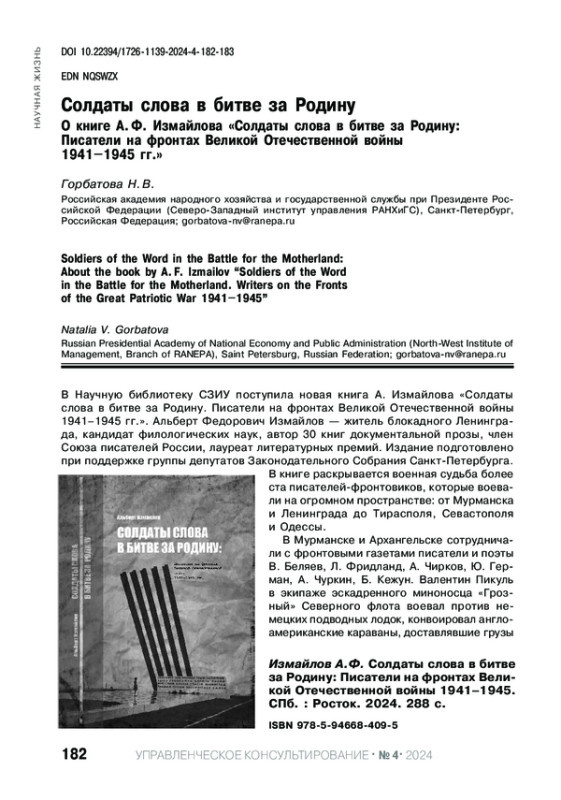 ГОРБАТОВА Н. В. СОЛДАТЫ СЛОВА В БИТВЕ ЗА РОДИНУ. О КНИГЕ А. Ф. ИЗМАЙЛОВА "СОЛДАТЫ СЛОВА В БИТВЕ ЗА РОДИНУ: ПИСАТЕЛИ НА ФРОНТАХ ВЕЛИКОЙ ОТЕЧЕСТВЕННОЙ ВОЙНЫ 1941-1945 ГГ." // УПРАВЛЕНЧЕСКОЕ КОНСУЛЬТИРОВАНИЕ. 2024. № 4 (184)