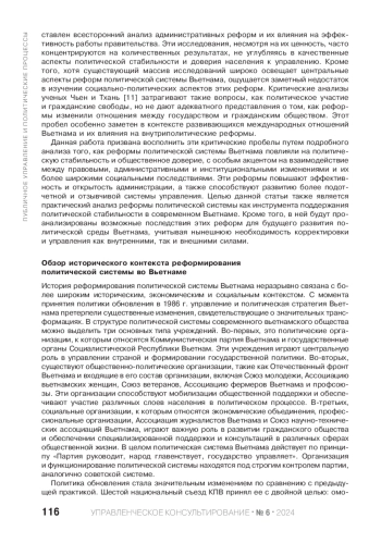 В последние десятилетия в политической среде Вьетнама произошли существенные изменения, характеризующиеся последовательными реформами, направленными на модернизацию политической структуры и обеспечение политической стабильности. Политика обновления, проведенная в конце 1980-х гг., преобразовала централизованную плановую экономику Вьетнама в рыночную и глобально интегрированную [1]. Этот переход потребовал одновременной корректировки политической системы. Политика обновления стала поворотным моментом в истории Вьетнама, обозначив переход от жестких структур к прагматичному и адаптируемому подходу к экономическому и политическому управлению. Хотя основной целью этих изменений является реструктуризация экономики, их политические последствия весьма значительны и оказывают влияние на систему управления Вьетнамом [2]. КПВ стратегически придерживается медленного и осторожного подхода к политическим изменениям, который служит важнейшим механизмом для эффективного управления сложностями модернизации при одновременном поддержании политического порядка и стабильности
