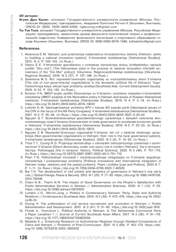 27. Thoa T. T. Problems of ensuring democracy under one-party rule in modern Vietnam // Territory Development. 2023. № 3. C. 66-73. DOI: 10.32324/2412-8945-2023-3-66-73 EDN: SXCAFM