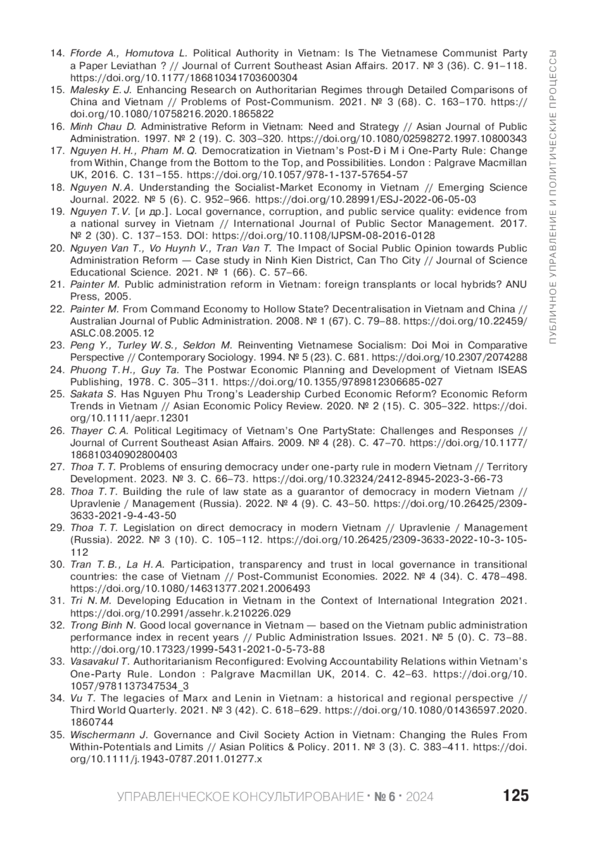 13. Duong H. The politicization of civil service recruitment and promotion in Vietnam // Public Administration and Development. 2021. № 2 (41). C. 51-62. DOI: 10.1002/pad.1910 EDN: KTHUJR