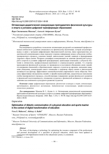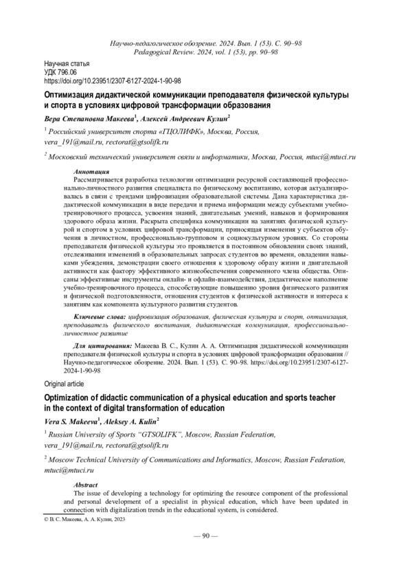 Актуальность обращения к тематике дидактической коммуникации связана с переходом высшей школы к цифровому образованию, которое принципиально меняет ее в пространстве реализации дисциплины «Физическая культура и спорт». В традиционную схему студент – преподаватель добавляется еще один компонент – цифровой образовательный ресурс, обладающий не только дидактическим потенциалом, но и который несет риски, связанные со смещением дидактической коммуникации вновь к технократическому стилю, игнорирующему личностные особенности субъектов взаимодействия и их потребности в самовоспитании и совершенствовании [1, 2]. Это актуализирует для специалистов физического воспитания обсуждение ряда вопросов, связанных с профессионально-личностным развитием преподавателя в условиях цифровизации и выстраиванием в цифровой среде модернизированной дидактической коммуникации [3, 4]. На современном этапе отсутствуют научно обоснованные и прошедшие достаточную апробацию на практике физкультурных подразделений (вузов, факультетов, кафедр физического воспитания) методики и технологии, помогающие современному преподавателю физической культуры и спорта эффективно интегрироваться в инновационную коммуникативно-дидактическую среду. Решению данной проблемы будет способствовать оптимизация дидактической коммуникации преподавателя физической культуры и спорта в инновационных условиях цифровой трансформации образования, что является целью исследования.
