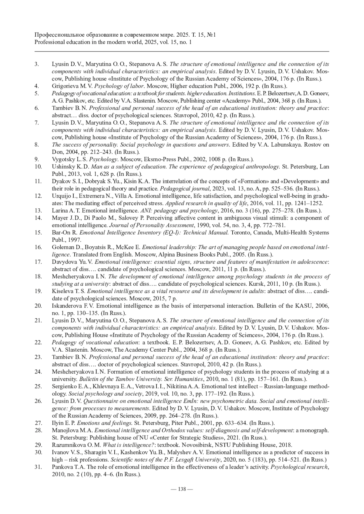 25. Сергиенко Е. А., Хлевная Е. А., Ветрова И. И., Никитина А. А. Тест эмоционального интеллекта - русскоязычная методика // Социальная психология и общество. 2019. Т. 10, № 3. С. 177-192.