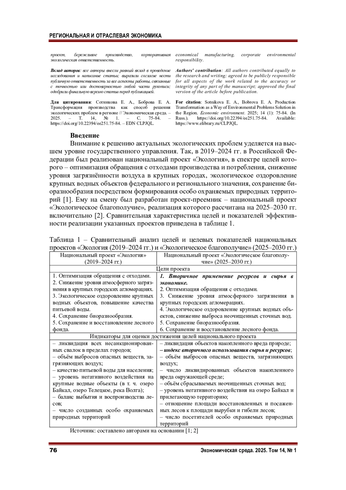 Внимание к решению актуальных экологических проблем уделяется на высшем уровне государственного управления. Так, в 2019–2024 гг. в Российской Федерации был реализован национальный проект «Экология», в спектре целей которого – оптимизация обращения с отходами производства и потребления, снижение уровня загрязнённости воздуха в крупных городах, экологическое оздоровление крупных водных объектов федерального и регионального значения, сохранение биоразнообразия посредством формирования особо охраняемых природных территорий [1]. Ему на смену был разработан проект-преемник – национальный проект «Экологическое благополучие», реализация которого рассчитана на 2025–2030 гг. включительно [2]. Сравнительная характеристика целей и показателей эффективности реализации указанных проектов приведена в таблице 1