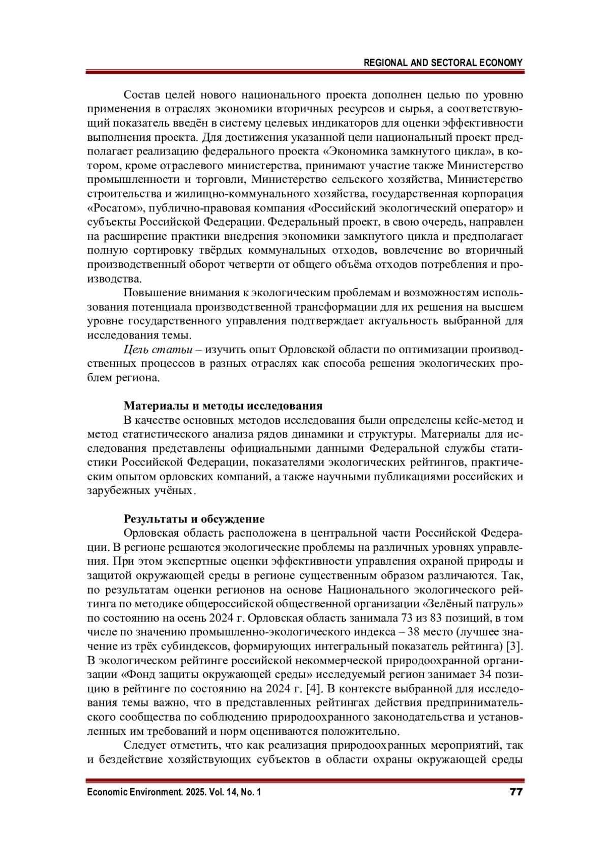В статье в контексте федеральной политики по обеспечению экологического благополучия в России рассматривается потенциал оптимизации производственных процессов как инструмента для решения экологических проблем Орловской области. Цель исследования заключается в рассмотрении опыта Орловской области по оптимизации производственных процессов в разных отраслях как способа решения экологических проблем в регионе. В процессе исследования применялся комплекс методов сравнительного анализа (группировки, сравнения, сопоставления, выборочного исследования) и статистического анализа (построение рядов динамики, расчет абсолютных и относительных величин, анализ структурных сдвигов). В результате проведенный анализ содержания нового национального проекта в сфере экологии показал, что одним из направлений такой трансформации производства является вторичное применение ресурсов и сырья в различных отраслях экономики. Инфраструктура по переработке и производству полуфабрикатов для этого в Орловской области уже сформирована, что позволяет положительно оценить перспективы решения данной задачи в регионе. Данные официальной статистики свидетельствуют о повышении инвестиций орловского бизнеса в природоохранные технологии и о влиянии отраслевой специфики регионального производства на их структуру. На конкретных кейсах рассмотрен положительный опыт трансформации производственных процессов, обеспечивающий как корпоративную экологическую ответственность, так и повышение финансовой эффективности деятельности компаний.