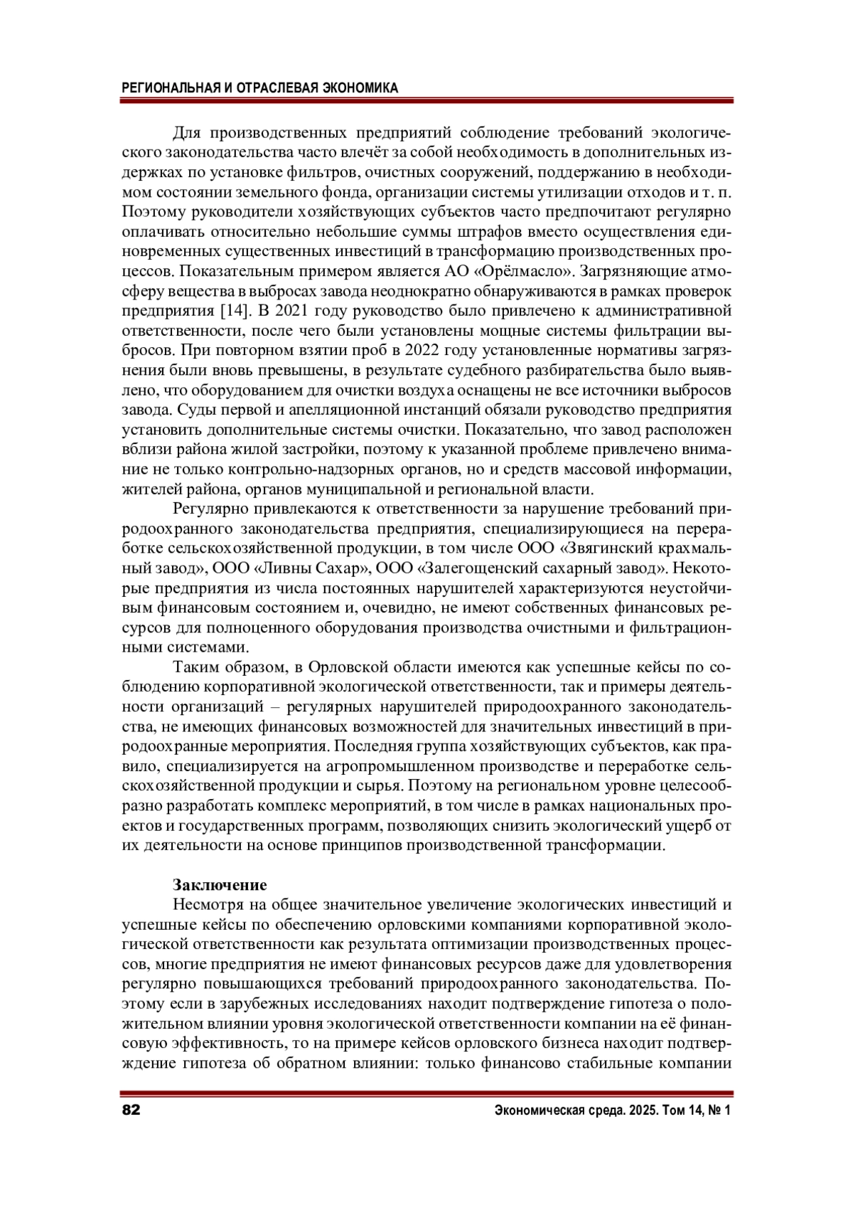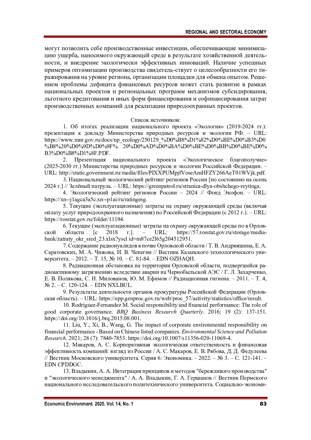 12. Макаров, А. С. Корпоративная экологическая ответственность и финансовая эффективность компаний: взгляд из России / А. С. Макаров, Е. В. Рябова, Д. Д. Федулеева // Вестник Московского университета. Серия 6: Экономика. - 2022. - № 3. - С. 121-141. EDN: CPDDGC