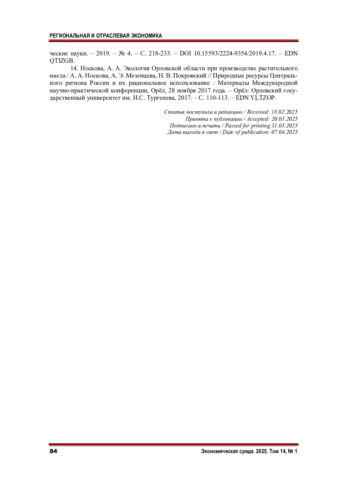 14. Носкова, А. А. Экология Орловской области при производстве растительного масла / А. А. Носкова, А. Э. Мезенцева, Н. В. Покровский // Природные ресурсы Центрального региона России и их рациональное использование: Материалы Международной научно-практической конференции, Орёл, 28 ноября 2017 года. - Орёл: Орловский государственный университет им. И.С. Тургенева, 2017. - С. 110-113. EDN: YLTZOP
