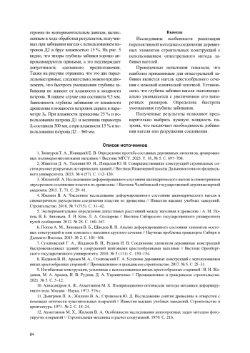 4. Жилкин В. А. Численное исследование деформированного состояния цилиндрического нагеля в симметричном двухсрезном соединении пластин из древесины // Известия высших учебных заведений. Строительство. 2018. № 7 (715). С. 31-42.