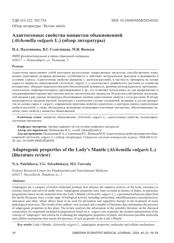 Адаптогены представляют собой категорию растительных лекарственных продуктов, способствующих повышению адаптивных резервов организма, устойчивости к действию экстремальных факторов и выживанию в условиях стресса. Адаптогенные свойства выявлены у десятков растений, в частности, препараты на основе сырья из манжетки обыкновенной (Alchemilla vulgaris L.), многолетнего травянистого растения из семейства розоцветных, обладают широким спектром биологической активности, включая антиоксидантную, противовос-палительную, нейропротекторную, противораковую и др., что позволяет использовать их для профилактики и поддерживающей терапии при лечении многих патологических процессов. Результаты собственных исследований авторов и ряд данных литературы обосновывают наличие адаптогенных свойств у этого растения. В обзоре анализируются сведения научной литературы о химическом составе соединений, входящих в состав препаратов на основе сырья A. vulgaris, современная трактовка понятия «адаптоген» и критерии оценки адаптогенных свойств растений, а также обсуждаются возможные молекулярно-клеточные механизмы, обеспечивающие наличие таких свойств у манжетки обыкновенной.