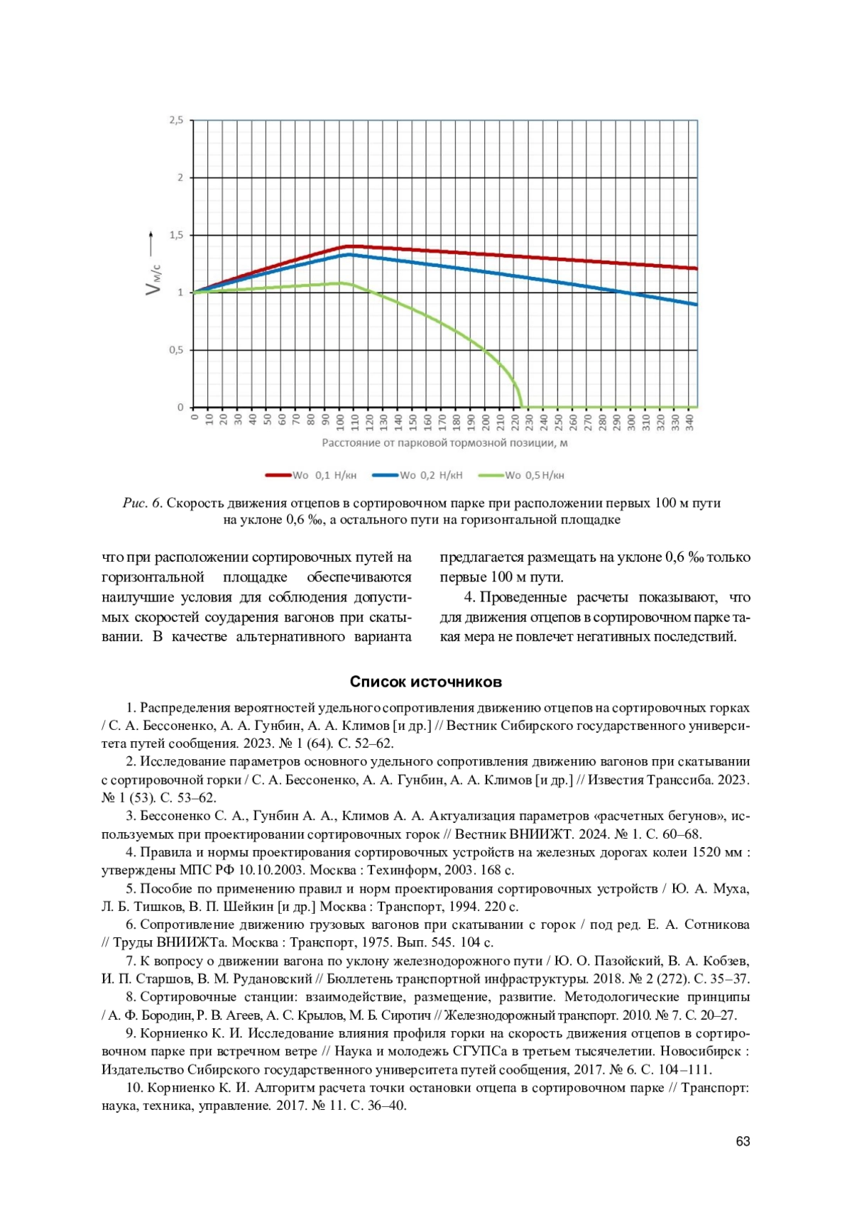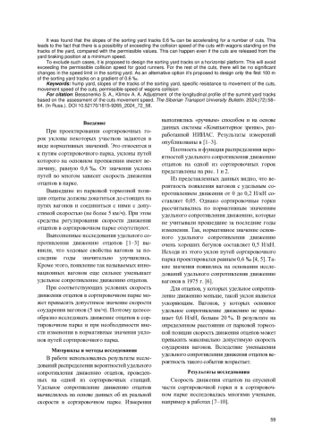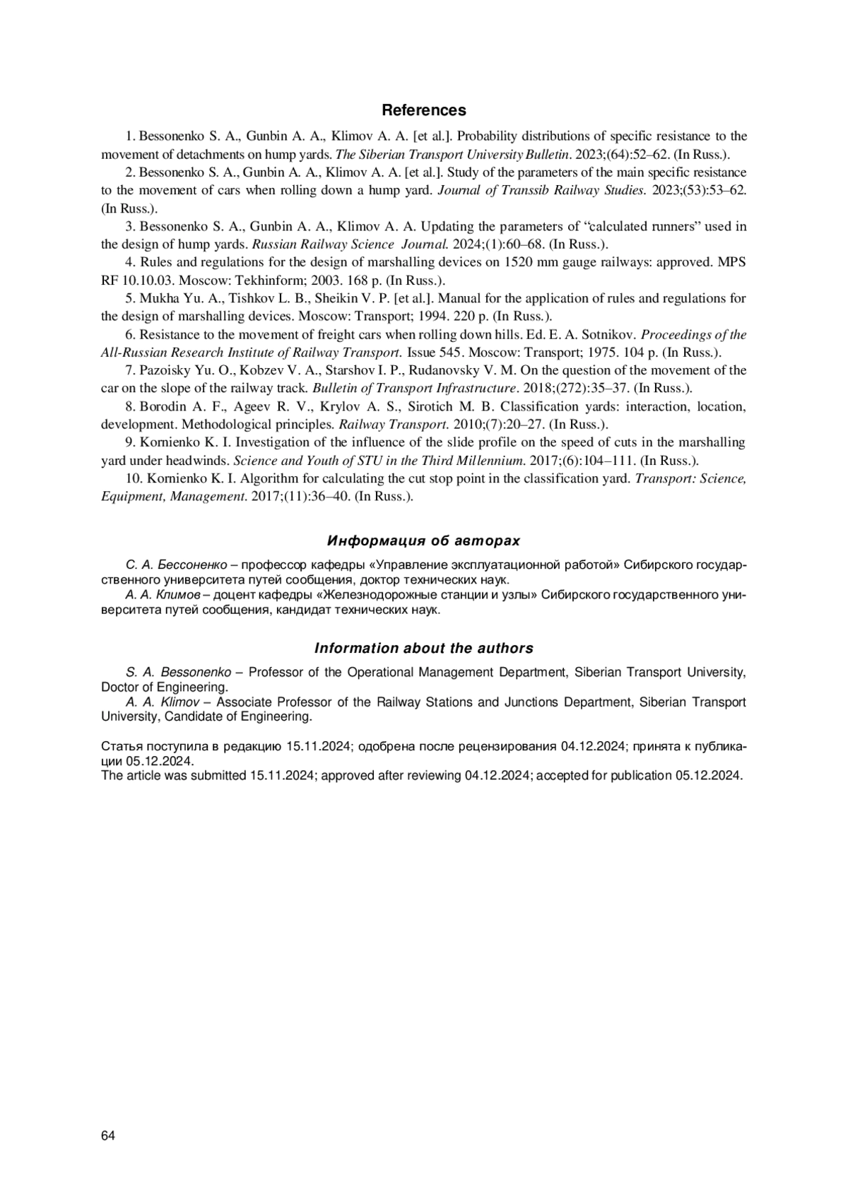 3. Бессоненко С. А., Гунбин А. А., Климов А. А. Актуализация параметров “расчетных бегунов”, используемых при проектировании сортировочных горок // Вестник ВНИИЖТ. 2024. № 1. С. 60-68. EDN: WURYLQ