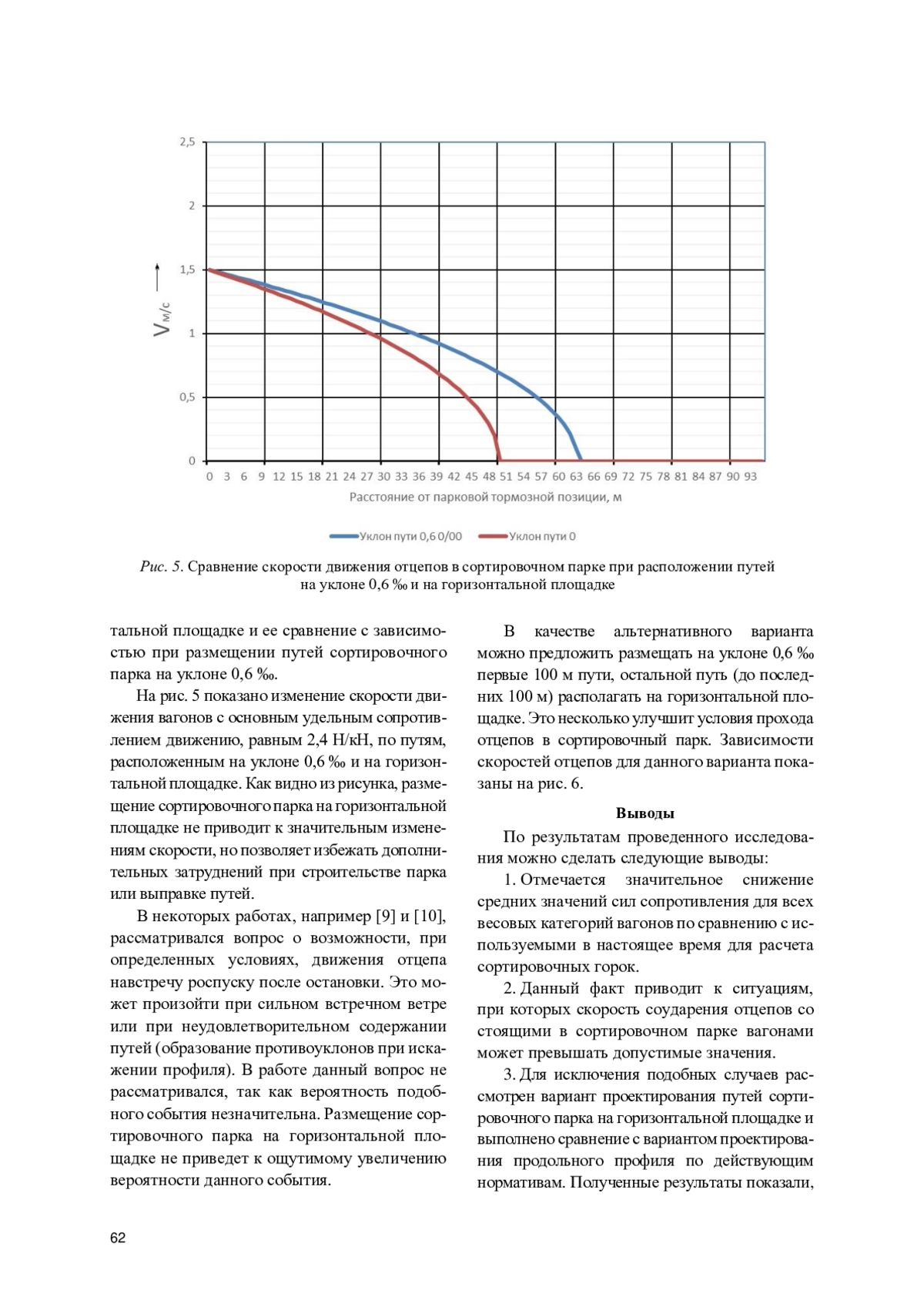 Для исключения подобных случаев предлагается проектировать пути сортировочного парка на горизонтальной площадке. Это позволит избежать превышения допустимой скорости соударения для хороших бегунов. Для остальных отцепов значительных изменений скоростного режима в сортировочном парке не произойдет. В качестве альтернативного варианта предложено проектировать на уклоне 0,6 % только первые 100 м путей сортировочного парка.