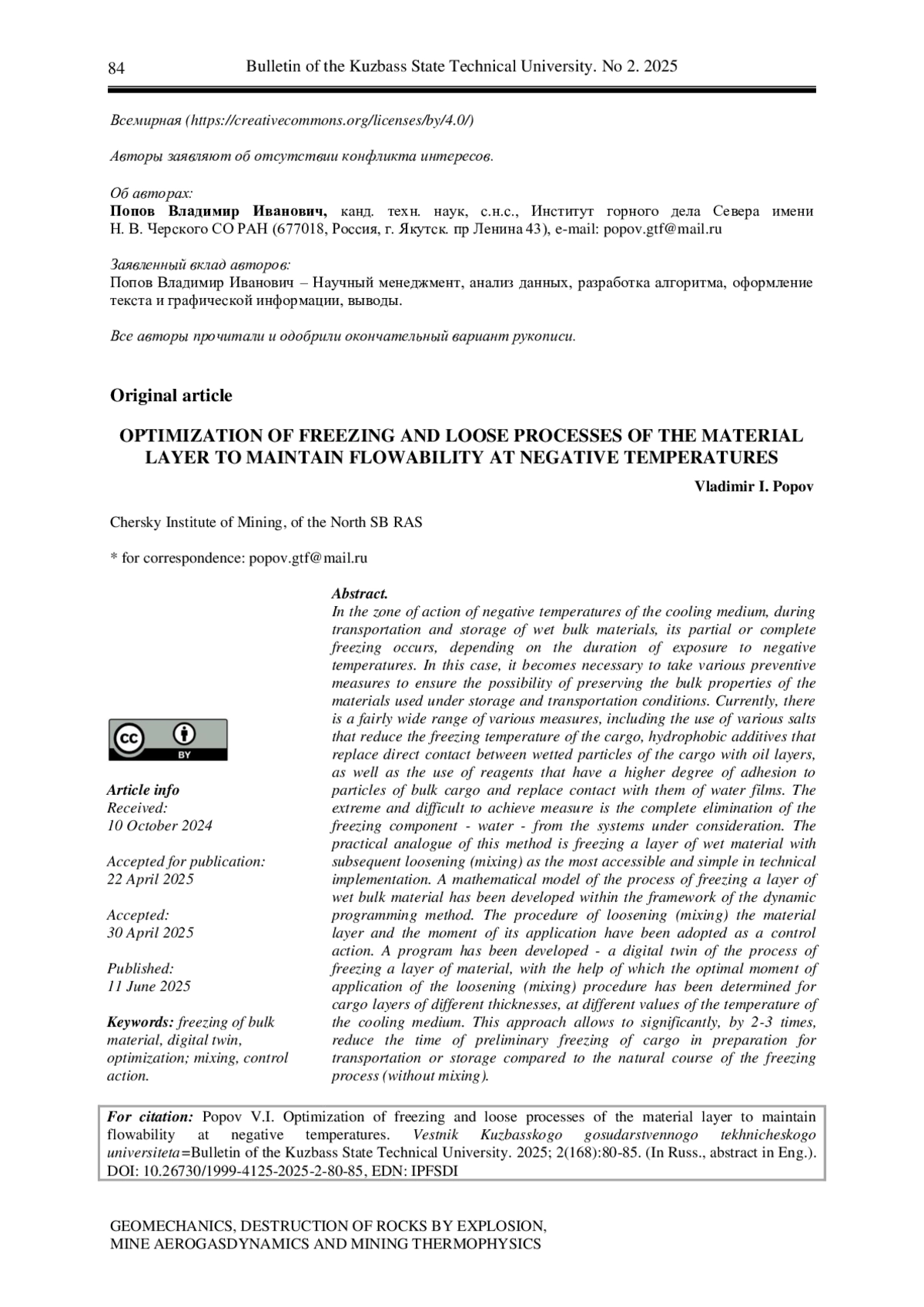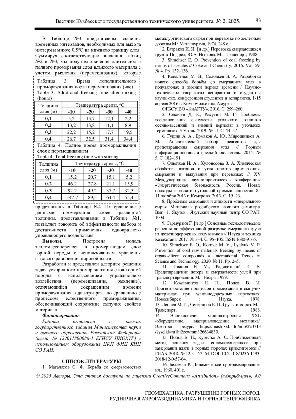 ПОПОВ В. И. ОПТИМИЗАЦИЯ ПРОЦЕССОВ ПРОМОРАЖИВАНИЯ И РЫХЛЕНИЯ СЛОЯ МАТЕРИАЛА ДЛЯ СОХРАНЕНИЯ СЫПУЧЕСТИ ПРИ ОТРИЦАТЕЛЬНЫХ ТЕМПЕРАТУРАХ // ВЕСТНИК КУЗБАССКОГО ГОСУДАРСТВЕННОГО ТЕХНИЧЕСКОГО УНИВЕРСИТЕТА. 2025. № 2 (168)