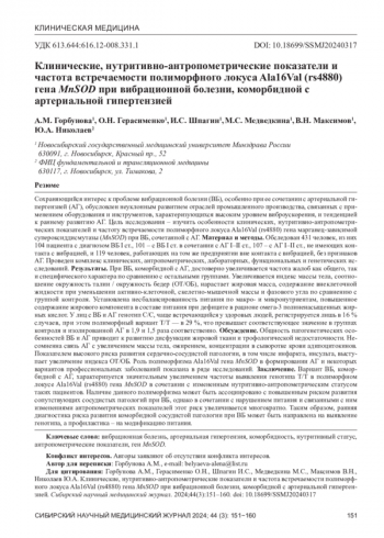 сомненна связь АГ с увеличением массы тела, ожирением, концентрации в сыворотке крови адипоцитокинов. Показателем высокого риска развития сердечно-сосудистой патологии, в том числе инфаркта, инсульта, выступает увеличение индекса ОТ/ОБ. Роль полиморфизма Ala16Val гена MnSOD в формировании АГ и некоторых вариантов профессиональных заболеваний показана в ряде исследований. Заключение. Вариант ВБ, коморбидной с АГ, характеризуется значительным увеличением частоты выявления генотипа Т/Т в полиморфном локусе Ala16Val (rs4880) гена MnSOD в сочетании с измененным нутритивно антропометрическим статусом таких пациентов. Наличие данного полиморфизма может быть ассоциировано с повышенным риском развития сопутствующих сосудистых патологий при ВБ, однако в сочетании с нарушением питания и связанными с ним изменениями антропометрических показателей этот риск увеличивается многократно. Таким образом, ранняя диагностика риска развития коморбидной сосудистой патологии при ВБ может быть направлена на выявление генотипа, а профилактика – на модификацию питания.