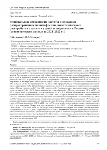 Цель исследования – анализ частоты встречаемости и динамики шизофрении, шизотипического расстройства и аутизма у детей и подростков в г. Москве и Кабардино-Балкарской Республике (КБР) за 2021–2022 гг. для определения потребности в оказании соответствующих мер поддержки данной группе населения. Материал и методы. Рассмотрена динамика первичной и общей заболеваемости психическими заболеваниями, в том числе среди детей и подростков, а также первичной и общей заболеваемости шизофренией (F20), шизотипическим расстройством (F21) и аутизмом среди детей и подростков в г. Москве и на территории КБР за 2021–2022 гг. Результаты и их обсуждение. Наблюдается прирост общей заболеваемости психическими заболеваниями за 2021 и 2022 гг. как в г. Москве (прирост 8,4 %), так и в КБР (прирост 0,3 %), в том числе среди детского населения (соответственно 10,9 и 2,2 %). Выявлено увеличение первичной заболеваемости психическими заболеваниями в г. Москве с приростом 23,7 %, в КБР с приростом 1,1 %, среди детского населения соответствующие значения составили 29,4 и 10,6 %. Общая заболеваемость шизофренией в г. Москве снизилась на 1,1 %, в КБР – на 0,5 %, среди детей и подростков – соответственно на 1,3 и 21,3 %. Общая заболеваемость шизотипическим расстройством в г. Москве повысилась на 9,1 %, в КБР – на 8,1 %, среди детского населения – соответственно на 7,9 и 0 %. Выявлено снижение показателя первичной заболеваемости шизофренией в г. Москве на 0,1 %, в КБР на 91 %. Среди детского населения в г. Москве она увеличилась 25,6 %, в КБР уменьшилась на 100 %, так же как и количество впервые выявленных случаев шизофрении. Первичная заболеваемость шизотипическим расстройством в г. Москве возросла на 34,1 %, в КБР – на 16,7 %, среди детей и подростков она соответственно снизилась