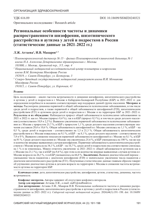 на 1 % и не изменилась. Можно отметить увеличение за 2021–2022 гг. общей заболеваемости аутизмом как в г. Москве (на 21,1 %), так и в КБР (на 9,4 %), при этом если количество впервые выявленных случаев аутизма в г. Москве возросло на 26,3 %, то в КБР уменьшилось на 66,8 %. Заключение. Выявлен диагностический перекос – уменьшение числа пациентов с диагнозом шизофрении (F20) и значительное увеличение числа пациентов с диагнозом шизотипического расстройства (F21). Полученные статистические данные главным образом говорят об улучшении диагностики аутизма в детском возрасте на территории г. Москвы и снижении частоты встречаемости аутизма на территории КБР.