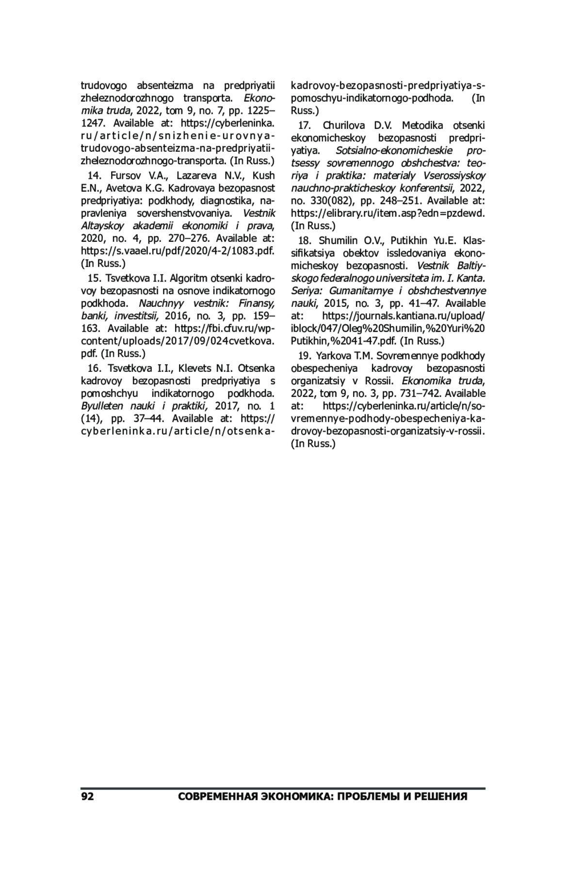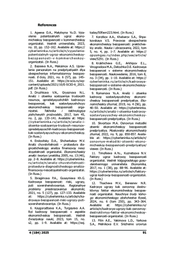 19. Яркова Т.М. Современные подходы обеспечения кадровой безопасности организации в России // Экономика труда, 2022, том 9, no. 3, с. 731-742. Доступно: https://cyberleninka.ru/article/n/sovremennye-podhody-obes pech-eniyakadrovoy-bezopasnosti-organizatsiy-vrossii (дата обращения: 24.04.2025). EDN: YYHCWQ
