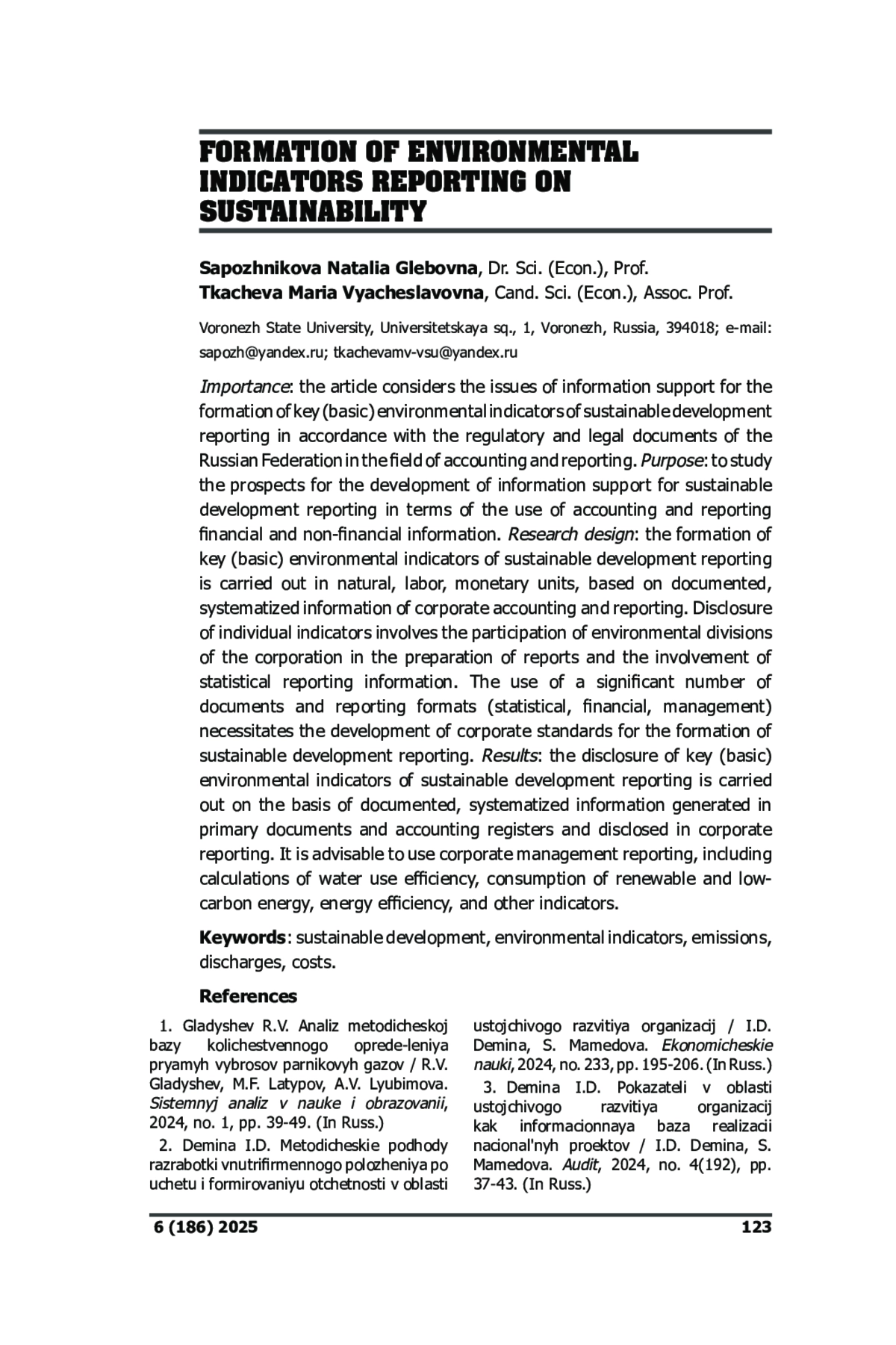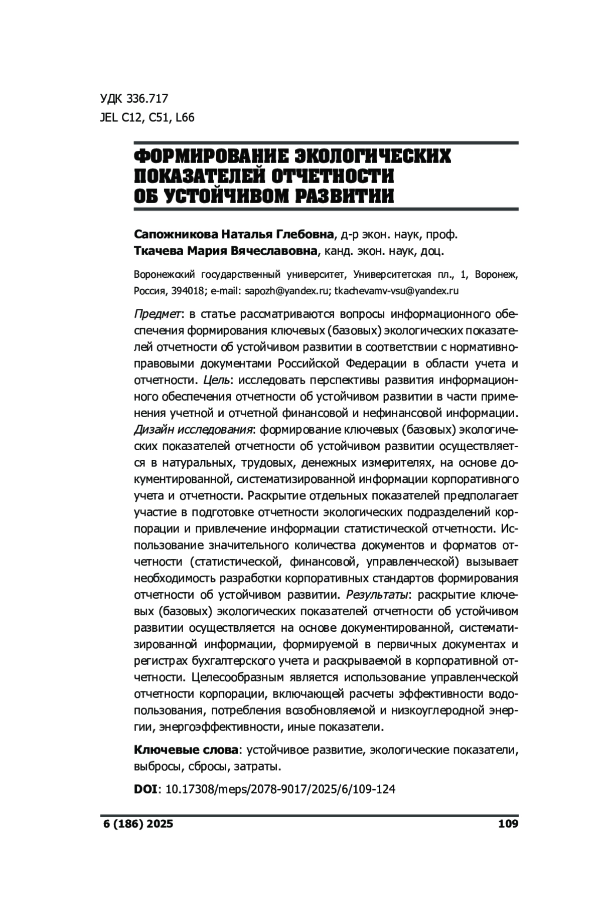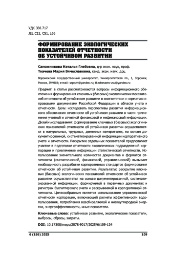 Предмет: в статье рассматриваются вопросы информационного обеспечения формирования ключевых (базовых) экономических показателей отчетности об устойчивом развитии в соответствии с нормативно-правовыми документами Российской Федерации в области учета и отчетности. Цель: исследовать перспективы развития информационного обеспечения отчетности об устойчивом развитии в части применения учетной и отчетной финансовой информации. Дизайн исследования: формирование ключевых (базовых) экономических показателей отчетности об устойчивом развитии осуществляется в денежном выражении, на основе документированной, систематизированной информации корпоративного учета и корпоративной отчетности. Раскрытие отдельных показателей предполагает проведение специальных расчетов, в частности, определение добавленной стоимости и чистой добавленной стоимости, доли закупок российских товаров, работ, услуг в общем объеме закупок у российских корпораций, экономической уязвимости хозяйственной и иной деятельности к климатическим рискам, иных. Результаты: подготовка отчетности об устойчивом развитии в части ключевых (базовых) экономических показателей, предполагает дополнения документооборота корпорации рядом первичных документов и внесения изменения в отдельные учетные регистры. Для обоснования налоговых расчетов, формирования резервов, уточнения учетных записей целесообразно использовать разрабатываемую и утверждаемую корпорацией справку-расчет. Информация о «зеленых» инвестициях, проектах, связанных с достижением технологического суверенитета, суммах начисленных и уплаченных налогов, сборов, иных платежей, закупках российских товаров, систематизируется в учетных регистрах, объединяющих аналитический и синтетический учет. Управленческая отчетность корпорации дополняется расчетами добавленной стоимости, производительности труда, результатами оценки климатических рисков хозяйственной и иной деятельности, иными, необходимыми для формирования экономических показателей отчетности об устойчивом развитии.
