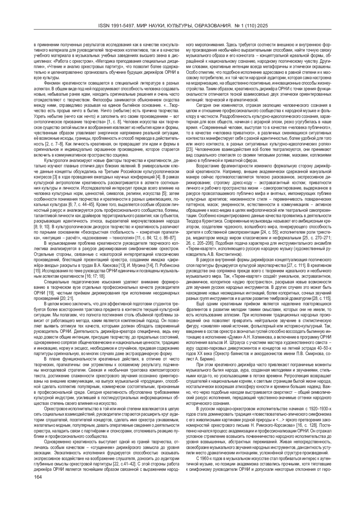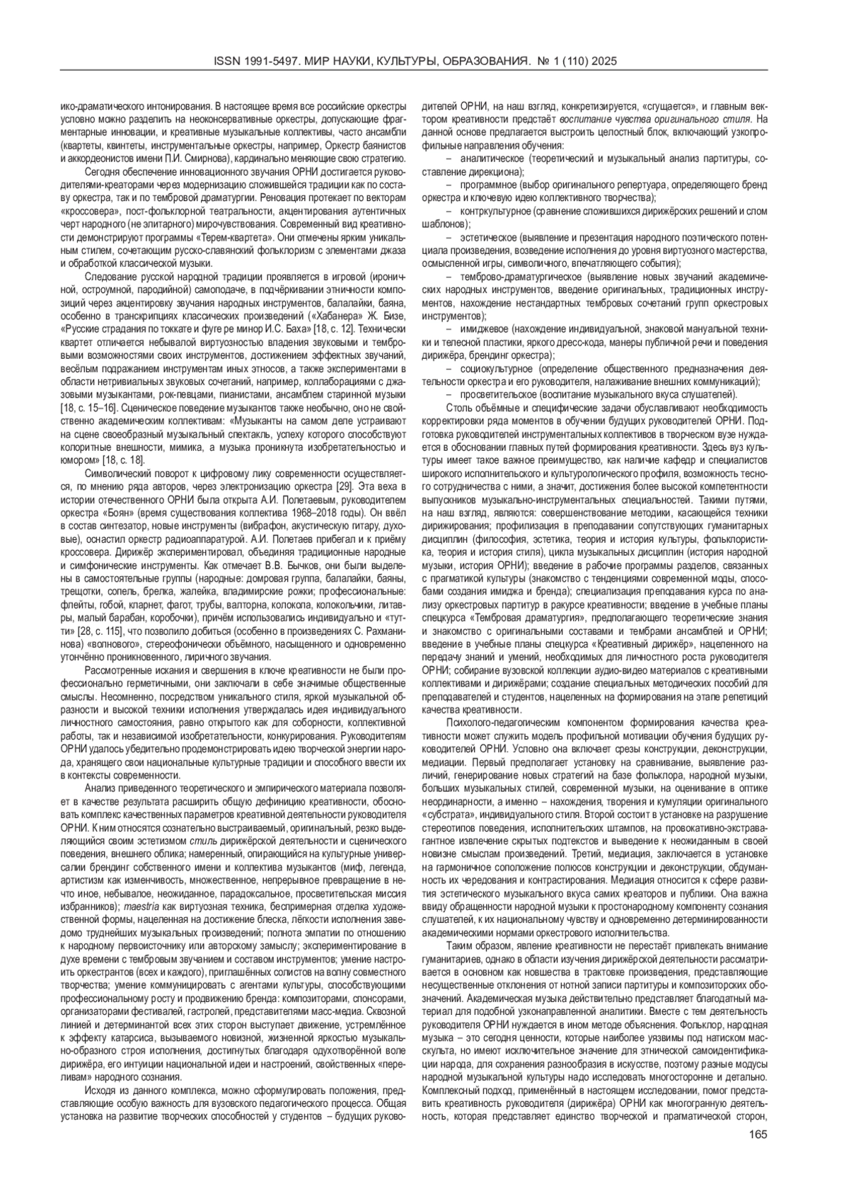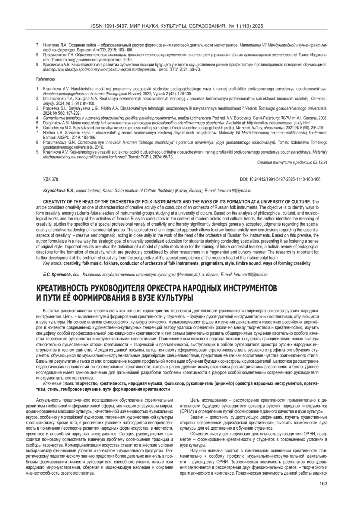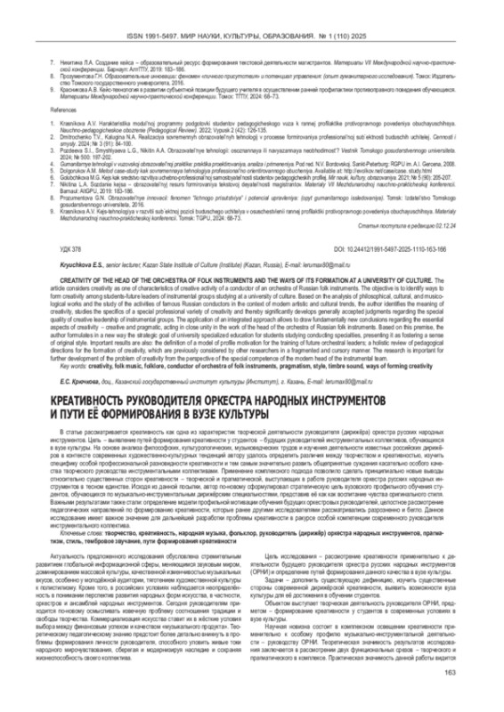 В статье рассматривается креативность как одна из характеристик творческой деятельности руководителя (дирижёра) оркестра русских народных инструментов. Цель - выявление путей формирования креативности у студентов - будущих руководителей инструментальных коллективов, обучающихся в вузе культуры. На основе анализа философских, культурологических, музыковедческих трудов и изучения деятельности известных российских дирижёров в контексте современных художественно-культурных тенденций автору удалось определить различия между творчеством и креативностью, изучить специфику особой профессиональной разновидности креативности и тем самым значительно развить общепринятые суждения касательно особого качества творческого руководства инструментальными коллективами. Применение комплексного подхода позволило сделать принципиально новые выводы относительно существенных сторон креативности - творческой и прагматической, выступающих в работе руководителя оркестра русских народных инструментов в тесном единстве. Исходя из данной посылки, автор по-новому сформулировал стратегическую цель вузовского профильного обучения студентов, обучающихся по музыкально-инструментальным дирижёрским специальностями, представив её как как воспитание чувства оригинального стиля. Важными результатами также стали: определение модели профильной мотивации обучения будущих оркестровых руководителей, целостное рассмотрение педагогических направлений по формированию креативности, которые ранее другими исследователями рассматривались разрозненно и бегло. Данное исследование имеет важное значение для дальнейшей разработки проблемы креативности в ракурсе особой компетенции современного руководителя инструментального коллектива.
