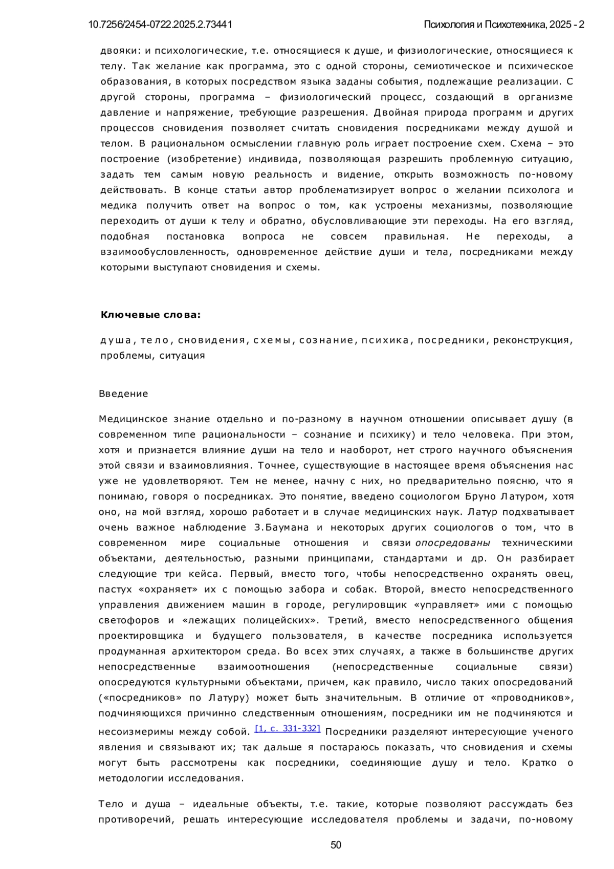 Медицинское знание отдельно и по-разному в научном отношении описывает душу (в современном типе рациональности ‒ сознание и психику) и тело человека. При этом, хотя и признается влияние души на тело и наоборот, нет строго научного объяснения этой связи и взаимовлияния. Точнее, существующие в настоящее время объяснения нас уже не удовлетворяют. Тем не менее, начну с них, но предварительно поясню, что я понимаю, говоря о посредниках. Это понятие, введено социологом Бруно Латуром, хотя оно, на мой взгляд, хорошо работает и в случае медицинских наук. Латур подхватывает очень важное наблюдение З. Баумана и некоторых других социологов о том, что в современном мире социальные отношения и связи опосредованы техническими объектами, деятельностью, разными принципами, стандартами и др. Он разбирает следующие три кейса. Первый, вместо того, чтобы непосредственно охранять овец, пастух «охраняет» их с помощью забора и собак. Второй, вместо непосредственного управления движением машин в городе, регулировщик «управляет» ими с помощью светофоров и «лежащих полицейских». Третий, вместо непосредственного общения проектировщика и будущего пользователя, в качестве посредника используется продуманная архитектором среда. Во всех этих случаях, а также в большинстве других непосредственные взаимоотношения (непосредственные социальные связи) опосредуются культурными объектами, причем, как правило, число таких опосредований («посредников» по Латуру) может быть значительным. В отличие от «проводников», подчиняющихся причинно следственным отношениям, посредники им не подчиняются и несоизмеримы между собой. [1, с. 331-332] Посредники разделяют интересующие ученого явления и связывают их; так дальше я постараюсь показать, что сновидения и схемы могут быть рассмотрены как посредники, соединяющие душу и тело. Кратко о методологии исследования.
