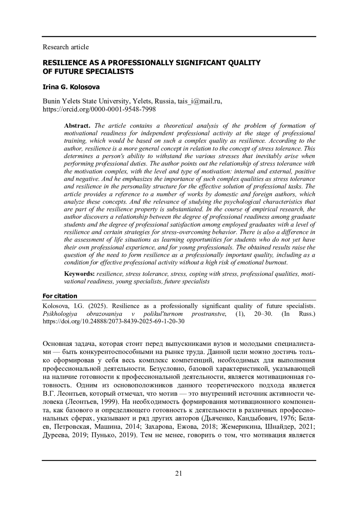 Статья содержит теоретический анализ проблемы формирования мотивационной готовности к самостоятельной профессиональной деятельности на этапе профессиональной подготовки, которая бы опиралась на такое комплексное качество, как жизнестойкость. По мнению автора, жизнестойкость является более общим понятием по отношению к понятию стрессоустойчивости. Что, в свою очередь, определяет способность личности противостоять разнообразным стрессам, которые неизбежно возникают при выполнении профессиональных обязанностей. Автор указывает на связь стрессоустойчивости с мотивационным комплексом, а, именно, с уровнем и видом мотивации: внутренней и внешней, положительной и отрицательной. И подчеркивает важность для эффективного решения профессиональных задач в структуре личности таких комплексных качеств, как стрессоустойчивость и жизнестойкость. В статье дается отсылка к ряду работ отечественных и зарубежных авторов, в которых осуществляется анализ этих понятий. И обосновывается актуальность изучения психологических характеристик, которые входят в состав свойства жизнестойкости. В процессе эмпирического исследования автор обнаруживает связь между степенью готовности к профессиональной деятельности у студентов выпускных курсов и степенью удовлетворенности профессией у трудоустроенных выпускников с уровнем жизнестойкости и определенными стратегиями стресс преодолевающего поведения. Определено также различие в оценке жизненных ситуаций как возможности обучения у студентов, пока не имеющих собственного профессионального опыта, и у молодых специалистов. Полученные результаты ставят вопрос о необходимости формирования жизнестойкости как профессионально важного качества, в том числе и как условия эффективной профессиональной деятельности без высокого риска эмоционального выгорания.