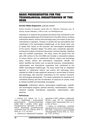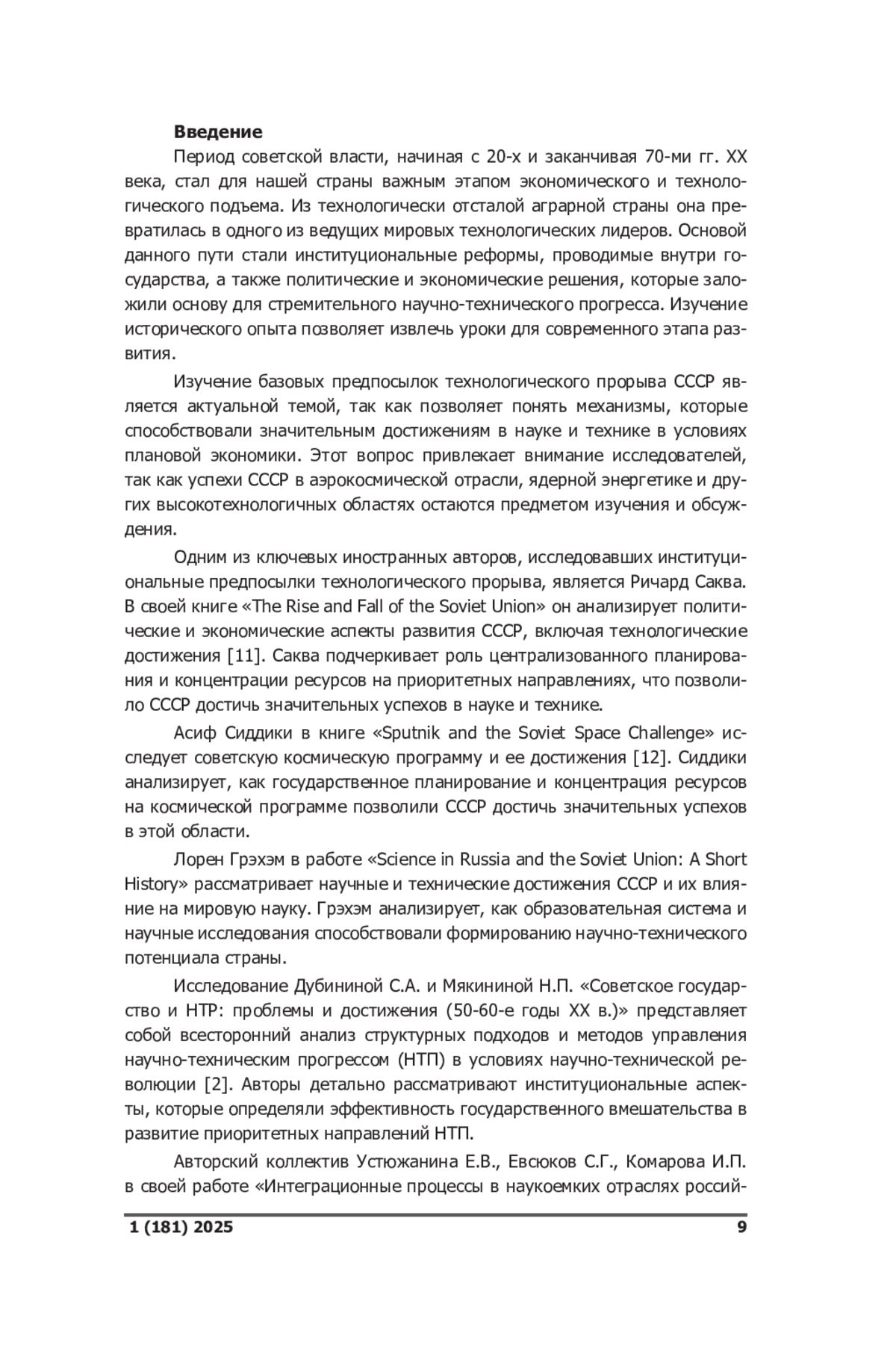 Изучение базовых предпосылок технологического прорыва СССР является актуальной темой, так как позволяет понять механизмы, которые способствовали значительным достижениям в науке и технике в условиях плановой экономики. Этот вопрос привлекает внимание исследователей, так как успехи СССР в аэрокосмической отрасли, ядерной энергетике и других высокотехнологичных областях остаются предметом изучения и обсуждения. Одним из ключевых иностранных авторов, исследовавших институциональные предпосылки технологического прорыва, является Ричард Саква. В своей книге «The Rise and Fall of the Soviet Union» он анализирует политические и экономические аспекты развития СССР, включая технологические достижения [11]. Саква подчеркивает роль централизованного планирования и концентрации ресурсов на приоритетных направлениях, что позволило СССР достичь значительных успехов в науке и технике.