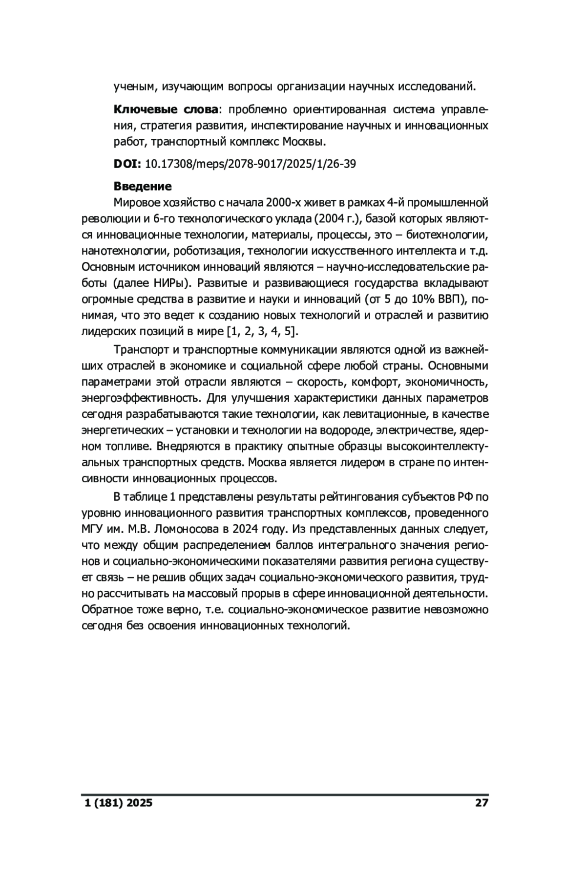 Предмет, организация научно-исследовательских и опытноконструкторских работ в целях совершенствования транспортного обеспечения города Москвы и повышения уровня благосостояния жителей города. Цель: проанализировать проблемные области существующей системы организации и проведения научно-технической политики транспортного комплекса города Москвы и разработать проблемно ориентированную систему распределения, выполнения и экспертизы соответствующих НИОКР. Дизайн исследования: на основе изложения опыта разработки и внедрения нового подхода к организации соответствующих исследований предложена методология оценки научных и инновационных работ на входе (актуальность, новизна, соответствие технического задания цели и сложности заявленной работы) и выходе (соответствие поставленным целям и техническому заданию, новизна и возможность внедрения). Выявлены и сформулированы основные принципы организации научноисследовательской работы. Результаты: предложена управленческая модель организации и экспертизы научно-технических работ, проводимых в интересах развития транспортного комплекса города Москвы. Описаны основные контуры взаимодействия и базовый функционал участников системы. Проанализирована перспективная тематика проводимых исследований и предложены направления ее совершенствования. На основе анализа ресурсного обеспечения выполнения программы разработаны меры поддержки проводимых мероприятий. Работа может быть интересна как практикам, занимающимся проблемами развития транспортного комплекса, так и ученым, изучающим вопросы организации научных исследований.