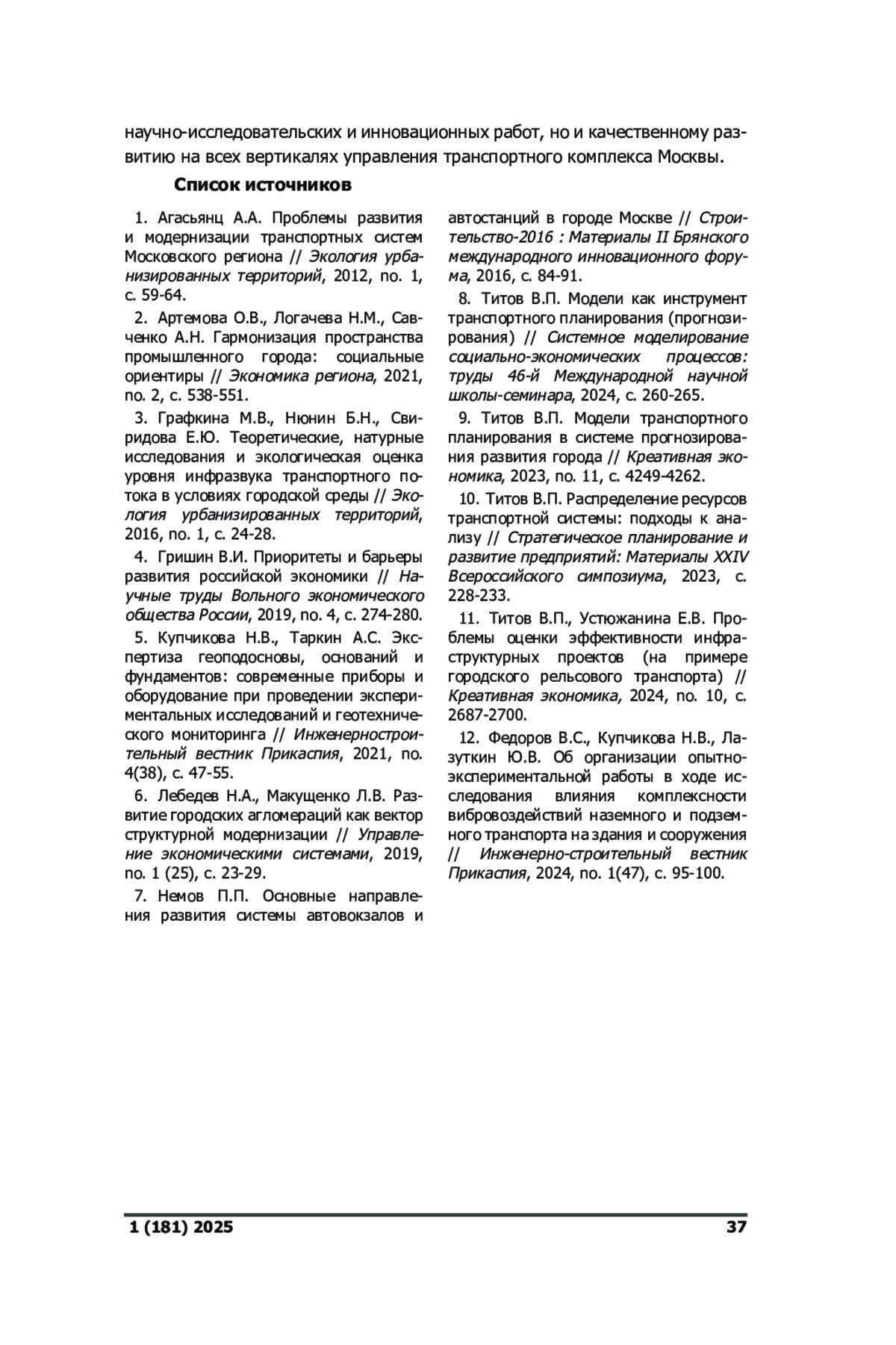 1. Агасьянц А.А. Проблемы развития и модернизации транспортных систем Московского региона // Экология урбанизированных территорий, 2012, no. 1, c. 59-64. EDN: PAMKDJ