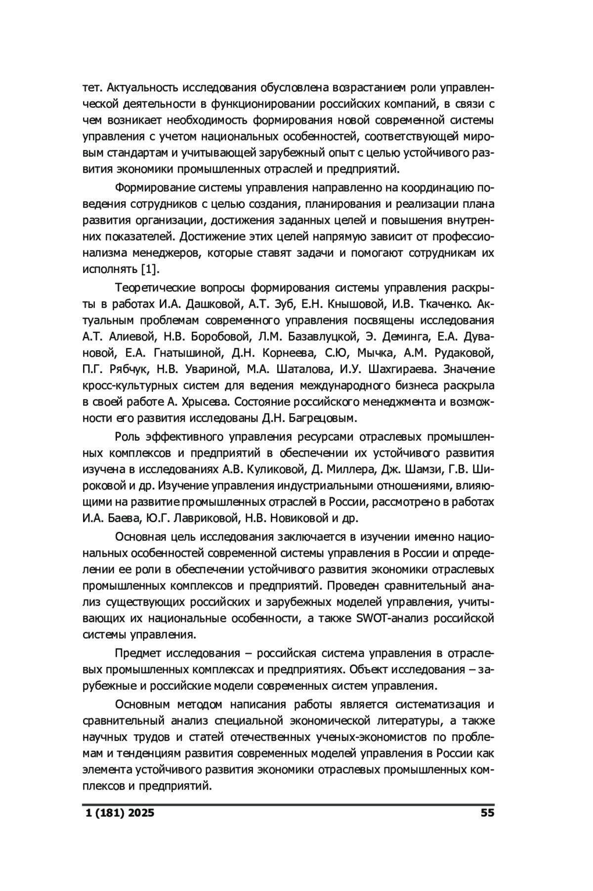 Роль эффективного управления ресурсами отраслевых промышленных комплексов и предприятий в обеспечении их устойчивого развития изучена в исследованиях А. В. Куликовой, Д. Миллера, Дж. Шамзи, Г. В. Широковой и др. Изучение управления индустриальными отношениями, влияющими на развитие промышленных отраслей в России, рассмотрено в работах И. А. Баева, Ю. Г. Лавриковой, Н. В. Новиковой и др. Основная цель исследования заключается в изучении именно национальных особенностей современной системы управления в России и определении ее роли в обеспечении устойчивого развития экономики отраслевых промышленных комплексов и предприятий. Проведен сравнительный анализ существующих российских и зарубежных моделей управления, учитывающих их национальные особенности, а также SWOT-анализ российской системы управления.