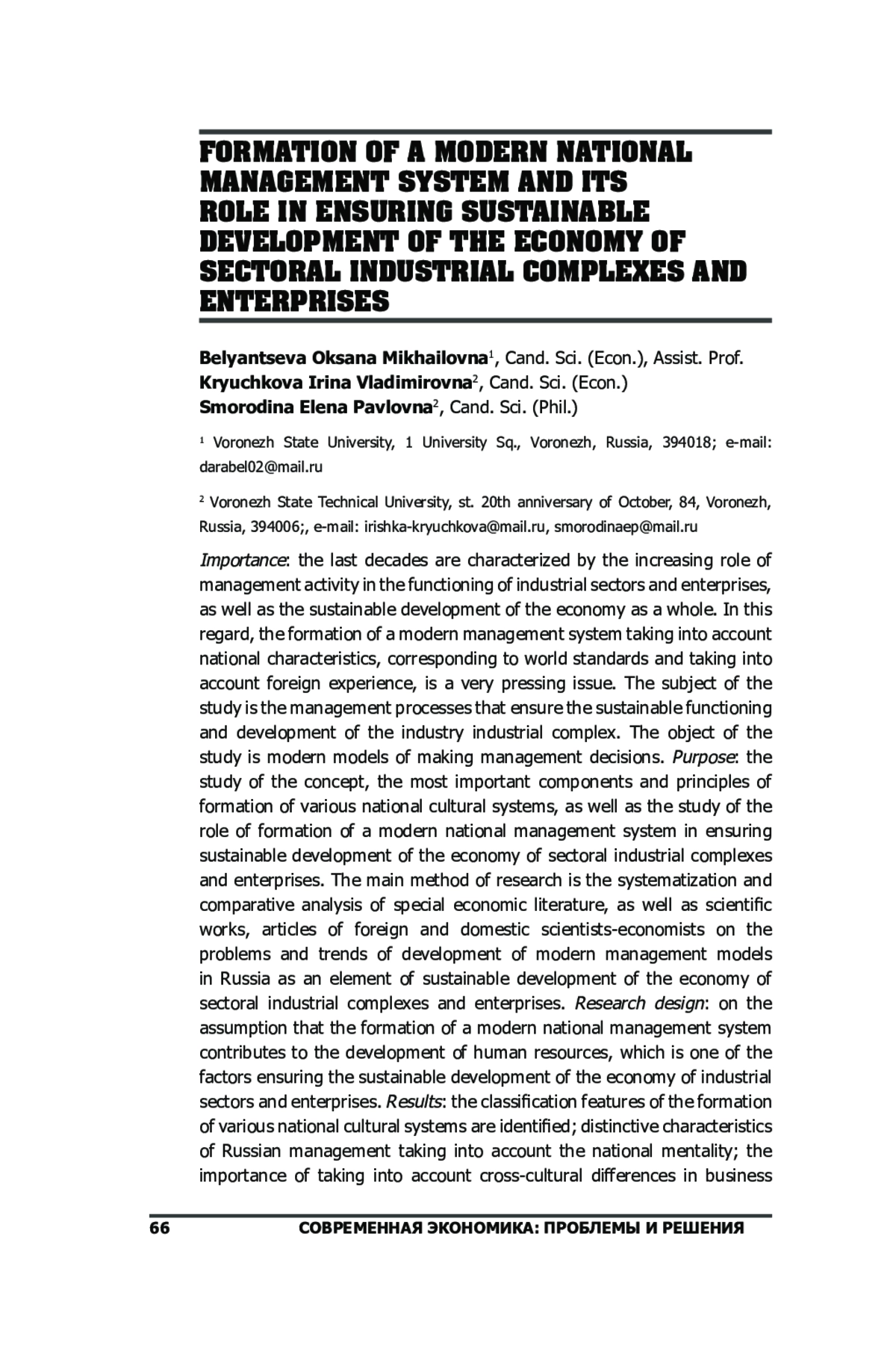 Предмет: последние десятилетия характеризуются возрастанием роли управленческой деятельности в функционировании промышленных отраслей и предприятий, а также устойчивом развитии экономики в целом. В связи с этим формирование современной системы управления с учетом национальных особенностей, соответствующей мировым стандартам и учитывающей зарубежный опыт, является весьма актуальным вопросом. Предметом исследования являются процессы управления, обеспечивающие устойчивое функционирование и развитие отраслевого промышленного комплекса. Объектом исследования являются современные модели принятия управленческих решений. Цель: исследование понятия, важнейших компонентов и принципов формирования различных национальных культурных систем, а также исследование роли формирования современной национальной системы управления в обеспечении устойчивого развития экономики отраслевых промышленных комплексов и предприятий. Основным методом исследования является систематизация и сравнительный анализ специальной экономической литературы, а также научных трудов, статей зарубежных и отечественных ученых-экономистов по проблемам и тенденциям развития современных моделей управления в России как элемента устойчивого развития экономики отраслевых промышленных комплексов и предприятий. Дизайн исследования: в предположении, что формирование современной национальной системы управления способствует развитию человеческих ресурсов, что является одним из факторов, обеспечивающих устойчивое развитие экономики промышленных отраслей и предприятий. Результаты: выделены классификационные признаки формирования различных национальных культурных систем; отличительные характеристики российского менеджмента с учетом национального менталитета; доказана важность учета кросс-культурных различий при ведении бизнеса и необходимость их изучения менеджерами для эффективного взаимодействия с коллегами разных национальностей; также выявлены основные проблемы становления современной российской системы управления, разработана интеллектуальная карта ее становления. Обоснована необходимость формирования современной национальной системы управления. Предложенная интеллектуальная карта становления современной системы управления, которая достаточно полно отражает все выявленные характеристики российского менеджмента, позволит сформировать модель современного менеджмента с учетом национального менталитета, реализация которой обеспечит устойчивое развитие экономики отраслевых промышленных комплексов и предприятий.