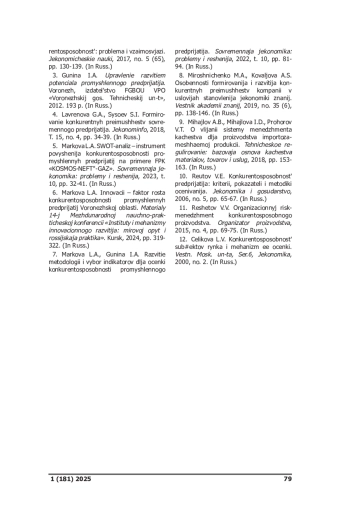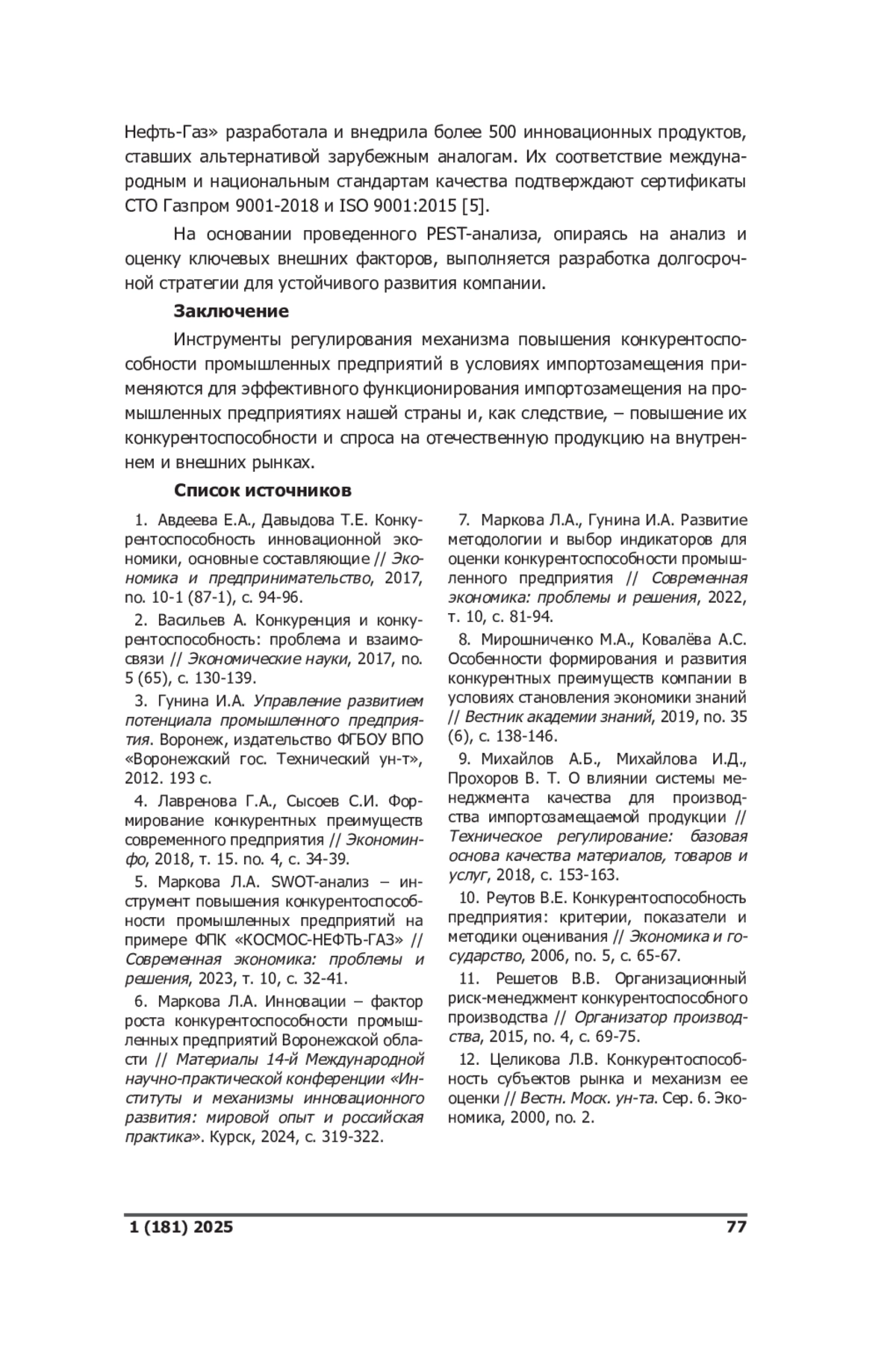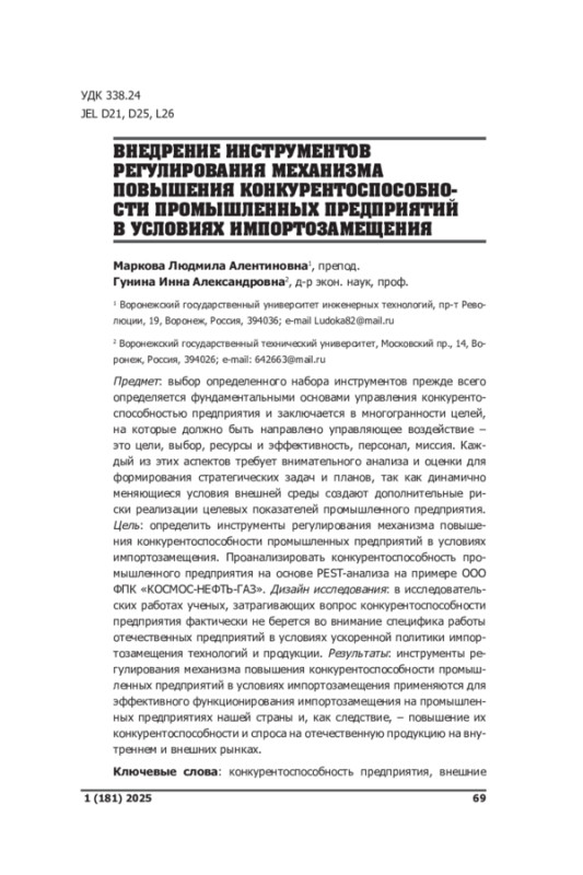 ГУНИНА И. А., МАРКОВА Л. А. ВНЕДРЕНИЕ ИНСТРУМЕНТОВ РЕГУЛИРОВАНИЯ МЕХАНИЗМА ПОВЫШЕНИЯ КОНКУРЕНТОСПОСОБНОСТИ ПРОМЫШЛЕННЫХ ПРЕДПРИЯТИЙ В УСЛОВИЯХ ИМПОРТОЗАМЕЩЕНИЯ // СОВРЕМЕННАЯ ЭКОНОМИКА: ПРОБЛЕМЫ И РЕШЕНИЯ. 2025. № 1 (181)