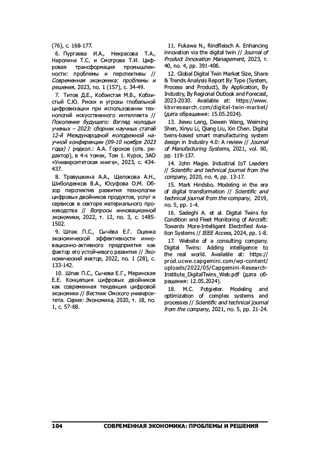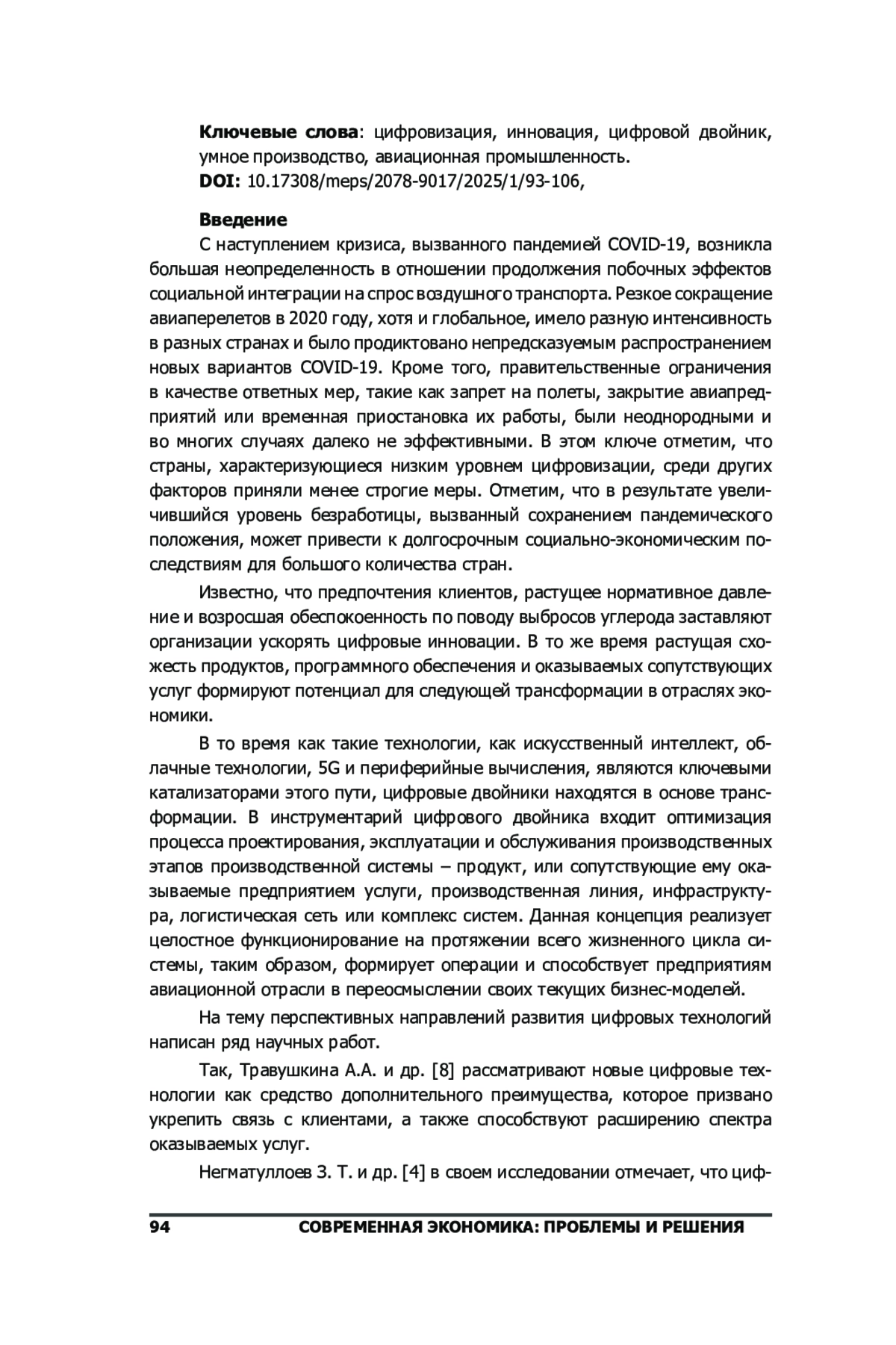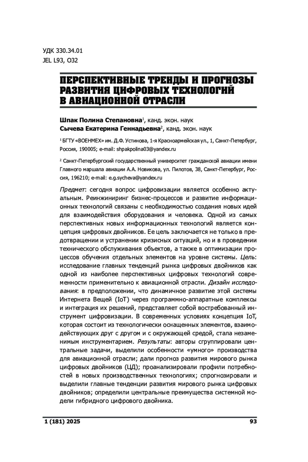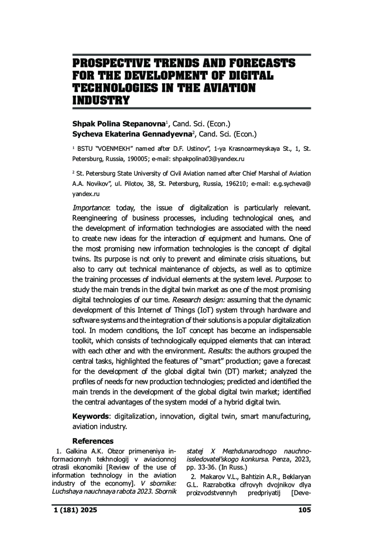 СЫЧЕВА Е. Г., ШПАК П. С. ПЕРСПЕКТИВНЫЕ ТРЕНДЫ И ПРОГНОЗЫ РАЗВИТИЯ ЦИФРОВЫХ ТЕХНОЛОГИЙ В АВИАЦИОННОЙ ОТРАСЛИ // СОВРЕМЕННАЯ ЭКОНОМИКА: ПРОБЛЕМЫ И РЕШЕНИЯ. 2025. № 1 (181)